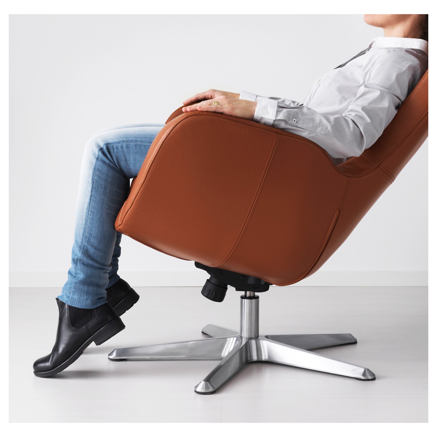 Регулируемый угол наклона можно увеличить или уменьшить в зависимости от веса тела. Рычаг под сиденьем. Высокоэластичный пенополиуретан обеспечивает оптимальный комфорт. Мягкая, прочная, простая в уходе кожа долго сохранит свой первоначальный вид. Небольшая обработка позволяет коже "дышать" и сохраняет её естественную структуру.