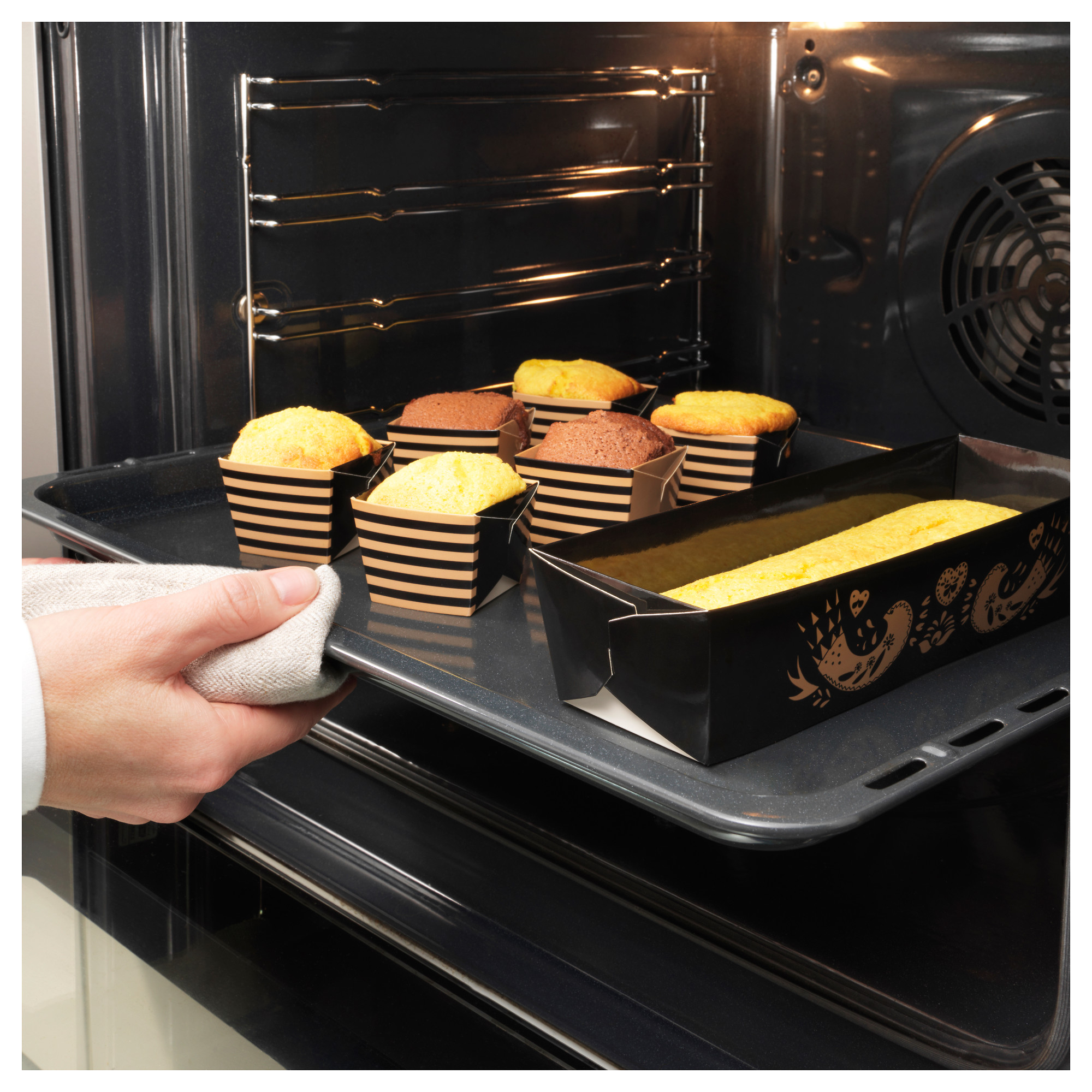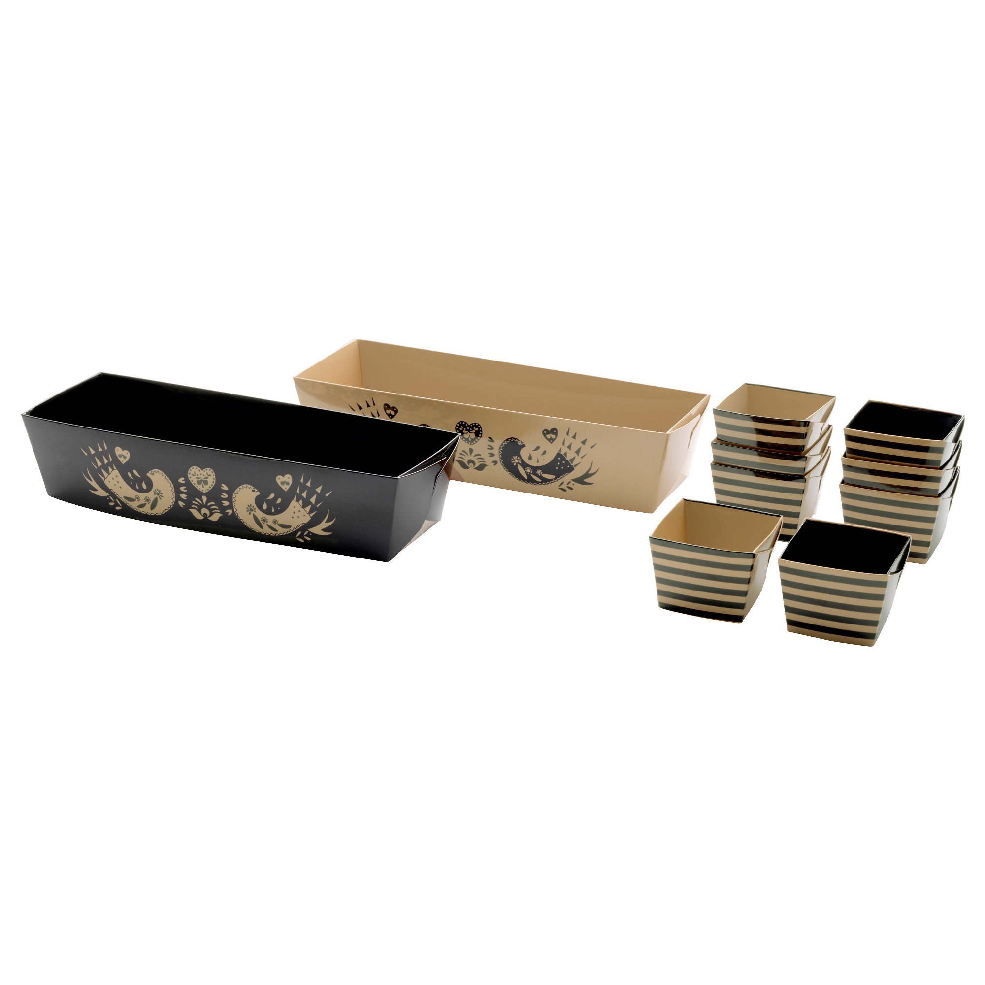 В набор входит: 2 формы для выпечки (длина 23 см, высота 5,5 см, ширина 6,5 см, объем 0,8 л) и 8 формочек для выпечки (длина 4,5 см, высота 4,5 см, ширина 4,5 см, объем 80 мл).
