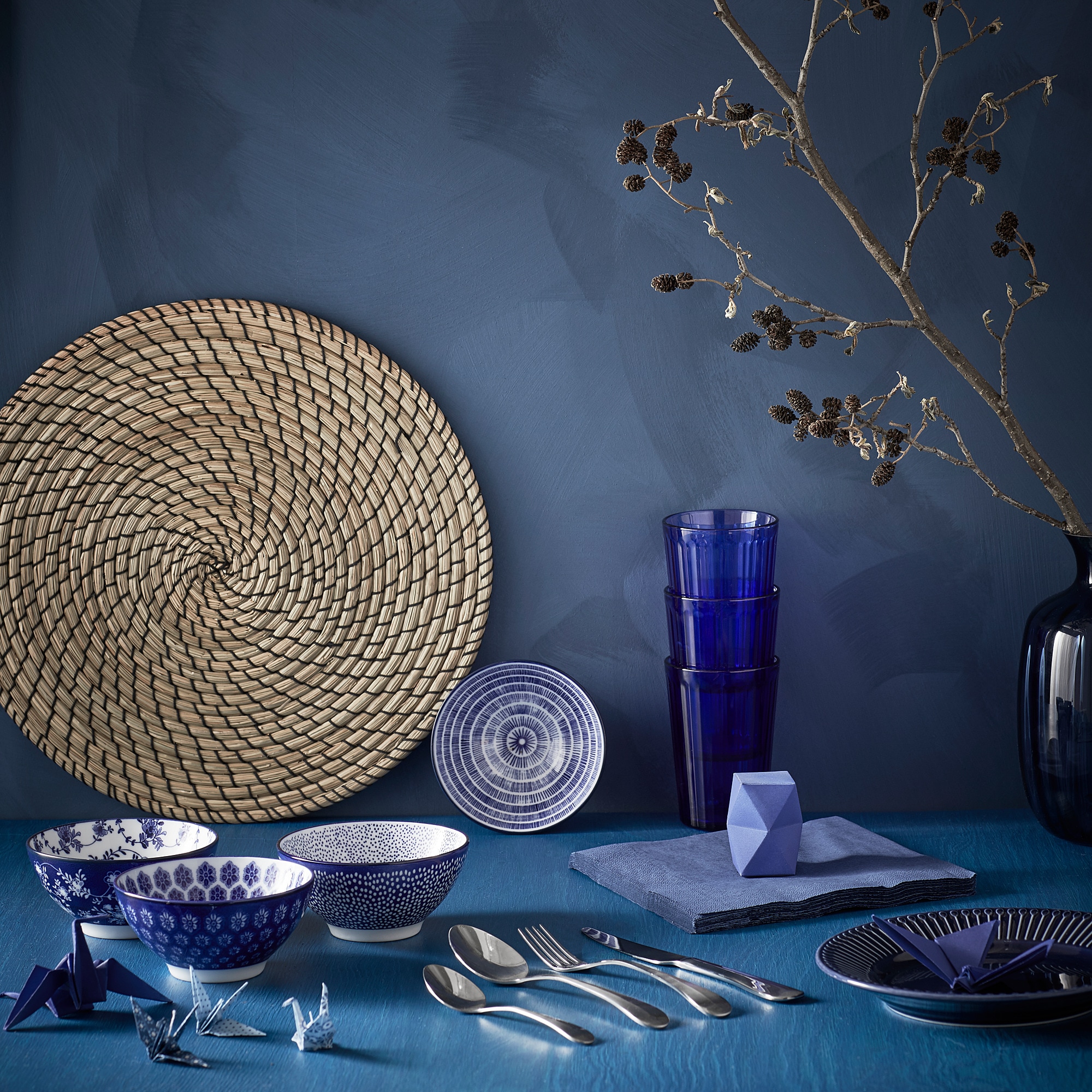 1 чаша ENTUSIASM, 4 предмета (диаметр 12 см), 1 набор столовых приборов GAMMAN из 24 предметов (вилка, нож, ложка и чайная ложка, по 6 штук), 1 подушечка LÄTTAD (диаметр 37 см), 1 десертная тарелка STRIMMIG ( диаметр 21 см) и 1 стакан ВАРДАГЕНА, 4 шт. (31 сл).