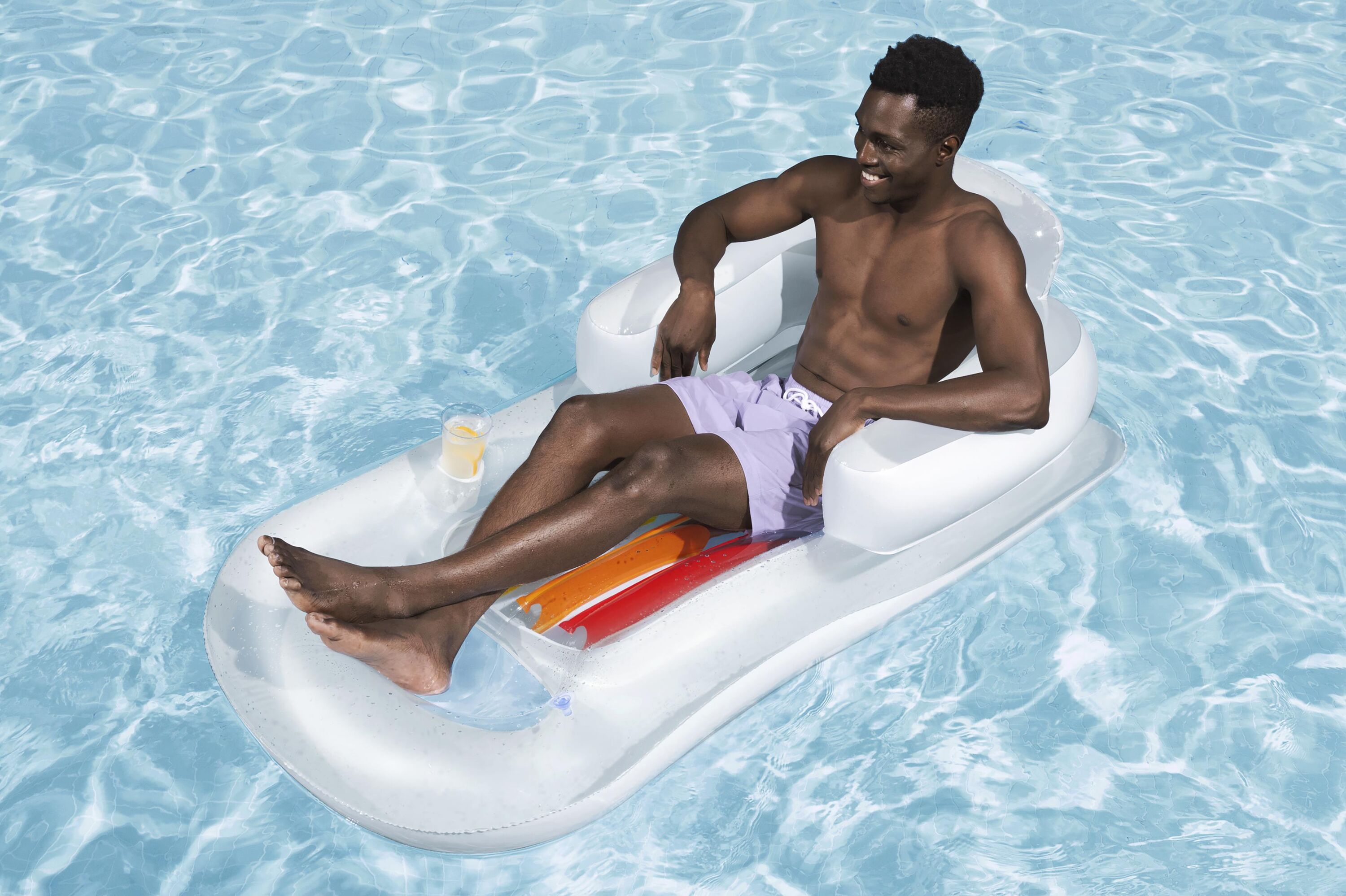 Надувний матрац із вінілу ідеально підійде для відпочинку біля води. Вініл — надзвичайно міцний і стійкий до пошкоджень матеріал, тому він чудово підійде для відпочинку на пляжі чи на траві. У кріслі встановлено сучасний тримач для чашок, завдяки чому ми матимемо безперервний доступ до улюбленого напою. Матрац BESTWAY має камеру для повітря, додатково захищену від витоку повітря назовні. Він виготовлений з м'якого, але міцного матеріалу. Надувна спинка та підлокітники забезпечують додатковий комфорт використання.
