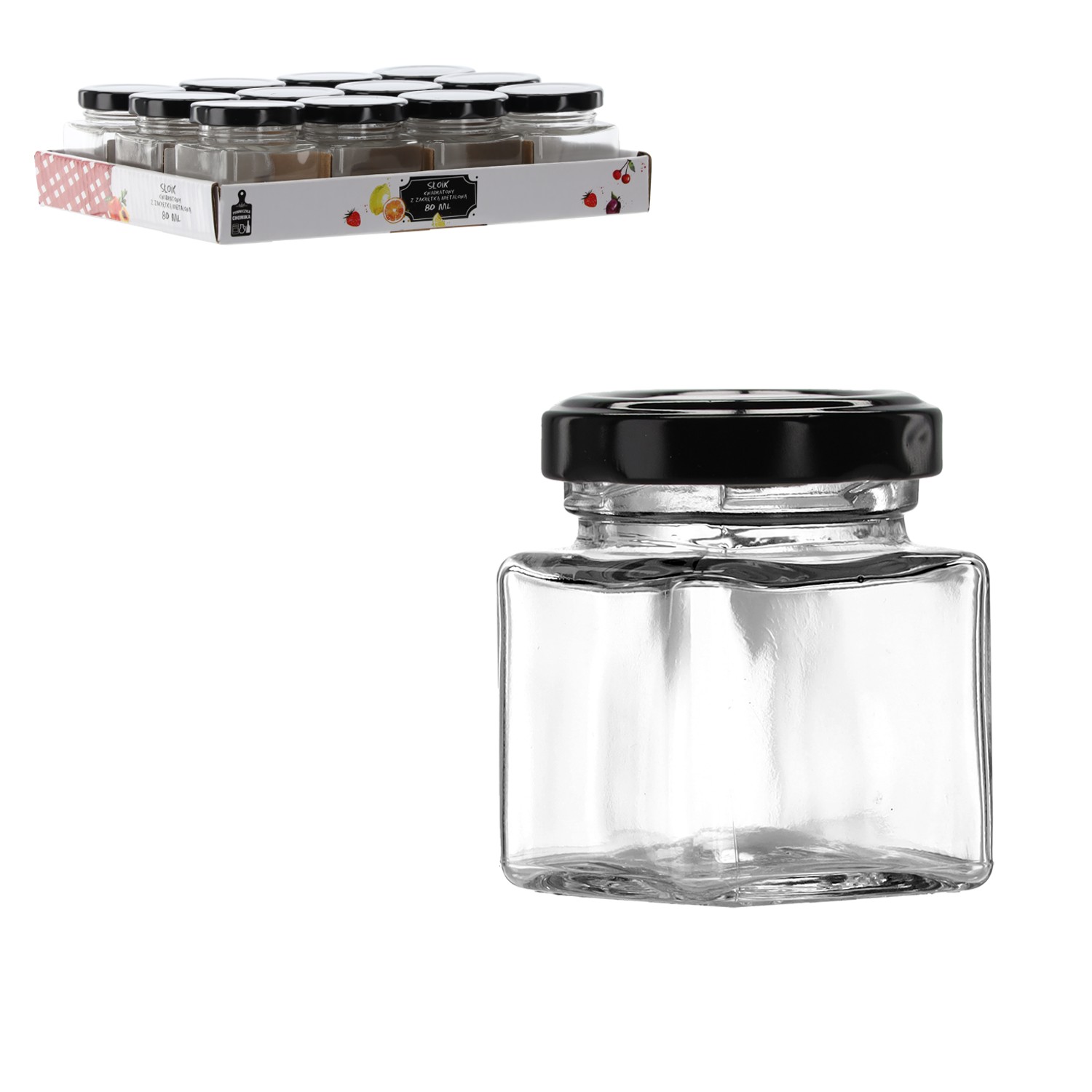 Квадратна банка місткістю 80 мл з чорною металевою кришкою — це елегантний варіант для зберігання меду, джемів, спецій та інших дрібних продуктів. Її компактна форма та герметична кришка забезпечують свіжість продуктів, що зберігаються. Продукт упакований в дисплей по 12 штук, що полегшує презентацію та роздрібний продаж.
