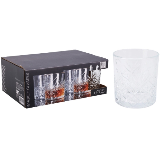 Набір з 6 склянок місткістю 340 мл кожна, ідеальний для подачі води, соків та інших напоїв. Класичний дизайн робить їх придатними як для щоденного використання, так і для світських зустрічей.