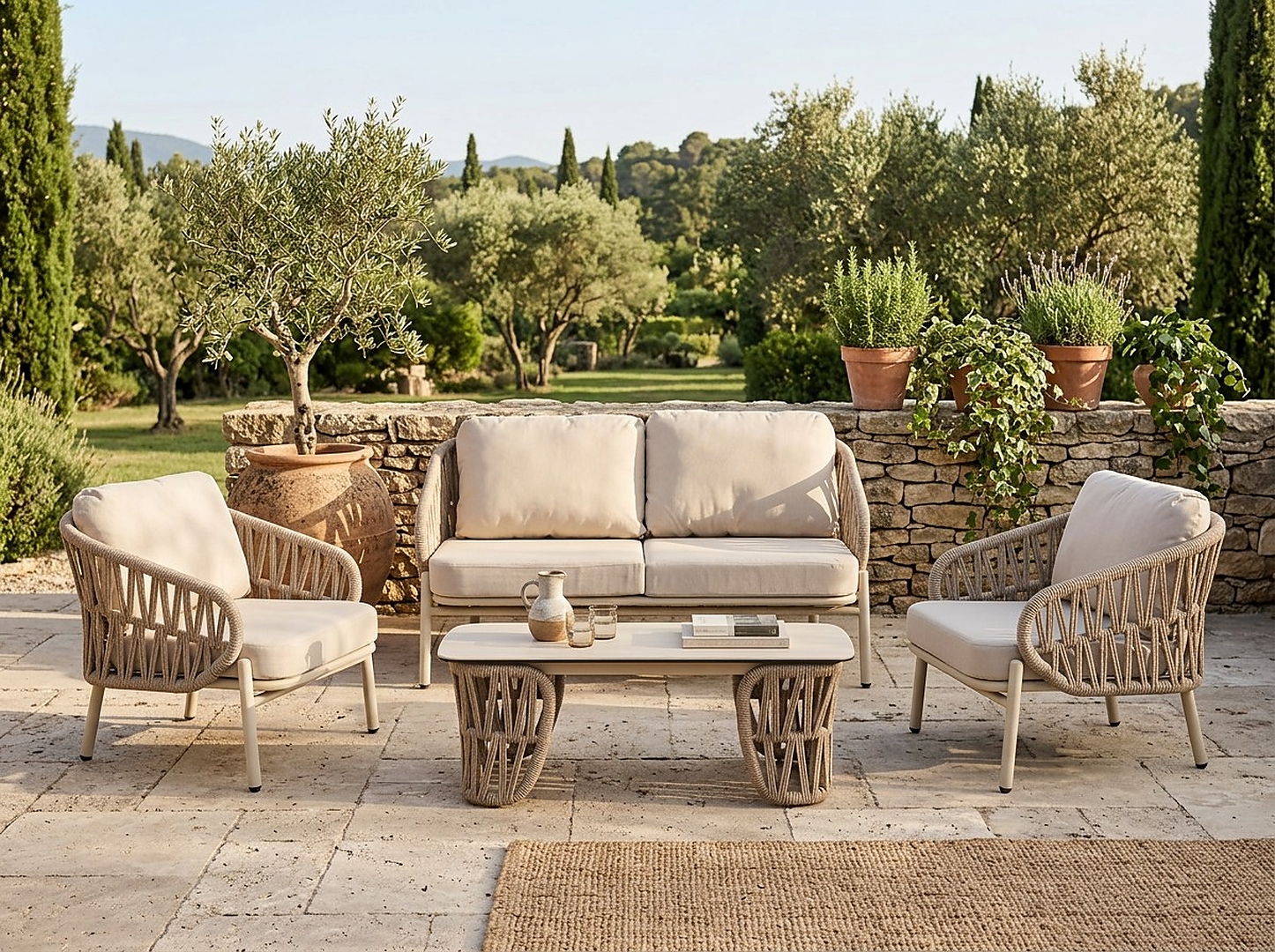 • Двомісний диван, 2 зручні крісла та великий журнальний столик• Ідеально підходить для щоденного відпочинку, кави та дружніх зустрічей• Універсальні пропорції, що пасують до саду, тераси та патіо