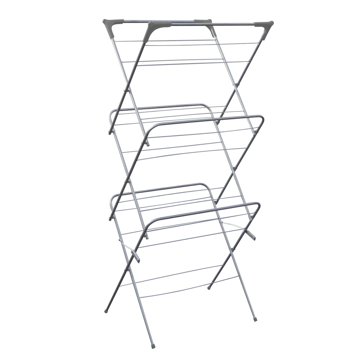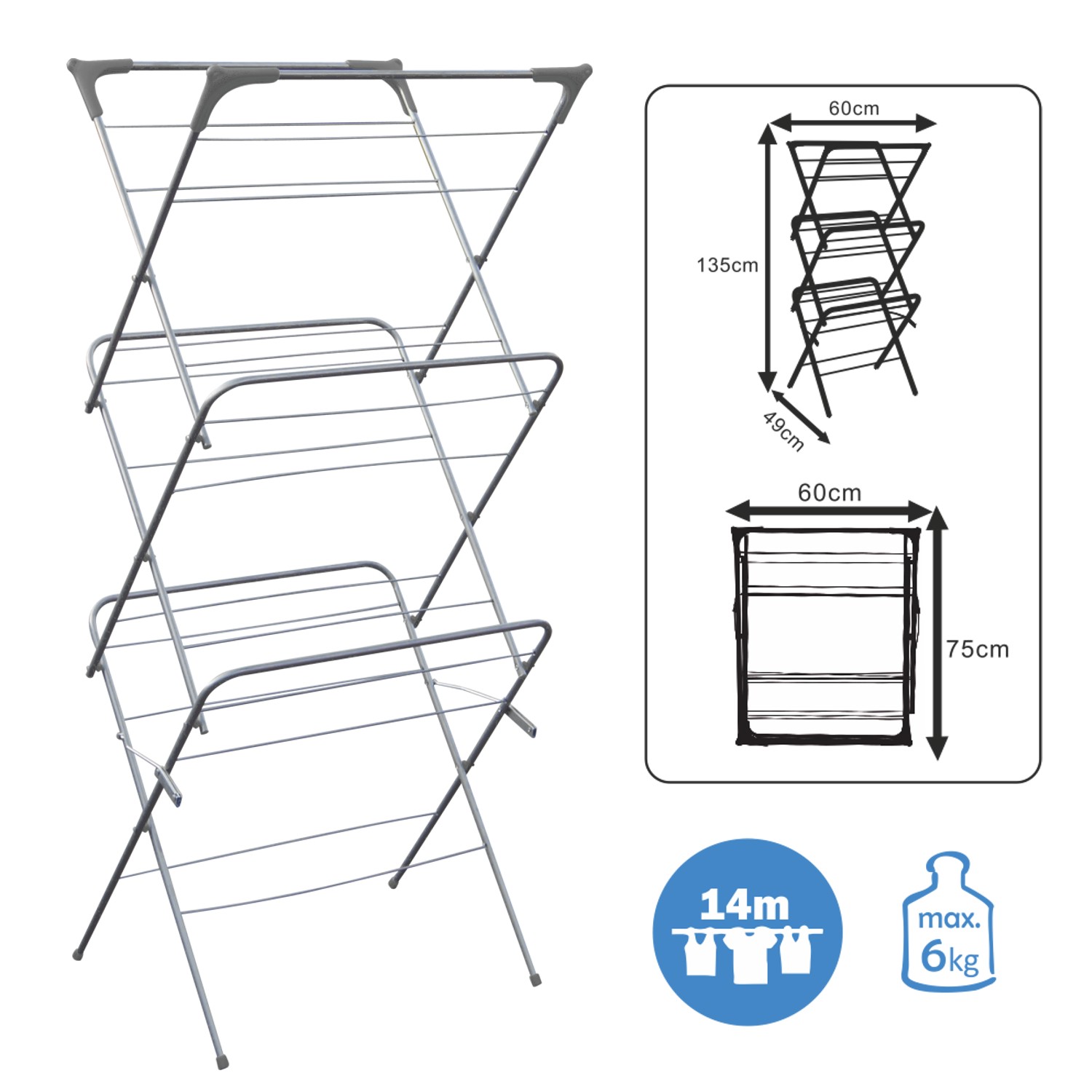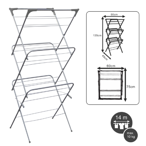 Сушарка оснащена трьома паралельними рівнями, на яких можна розвісити білизну. Це дозволяє ефективно використовувати доступну площу, даючи можливість одночасно сушити більшу кількість одягу, рушників або постільної білизни.
