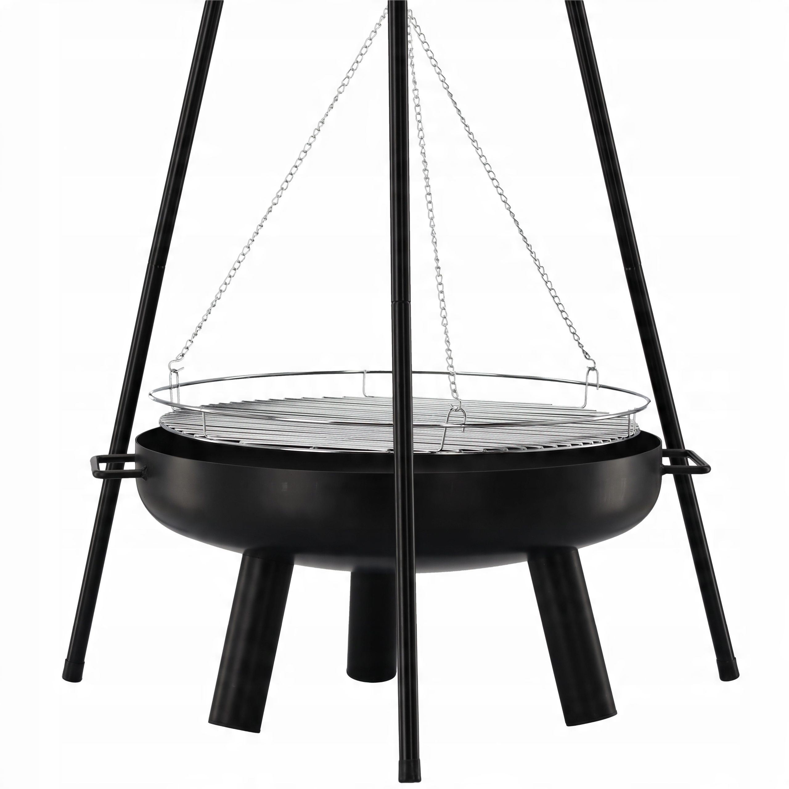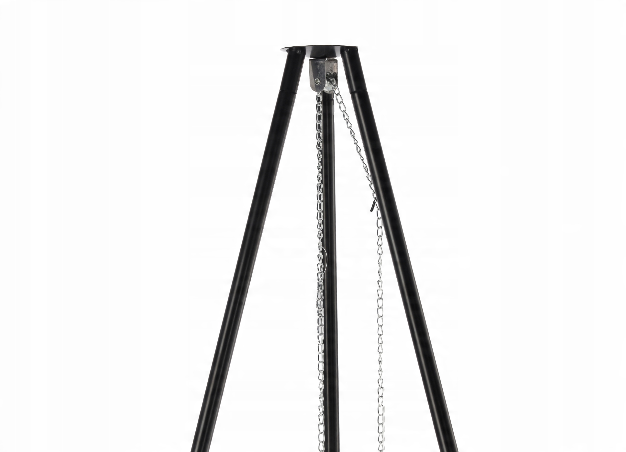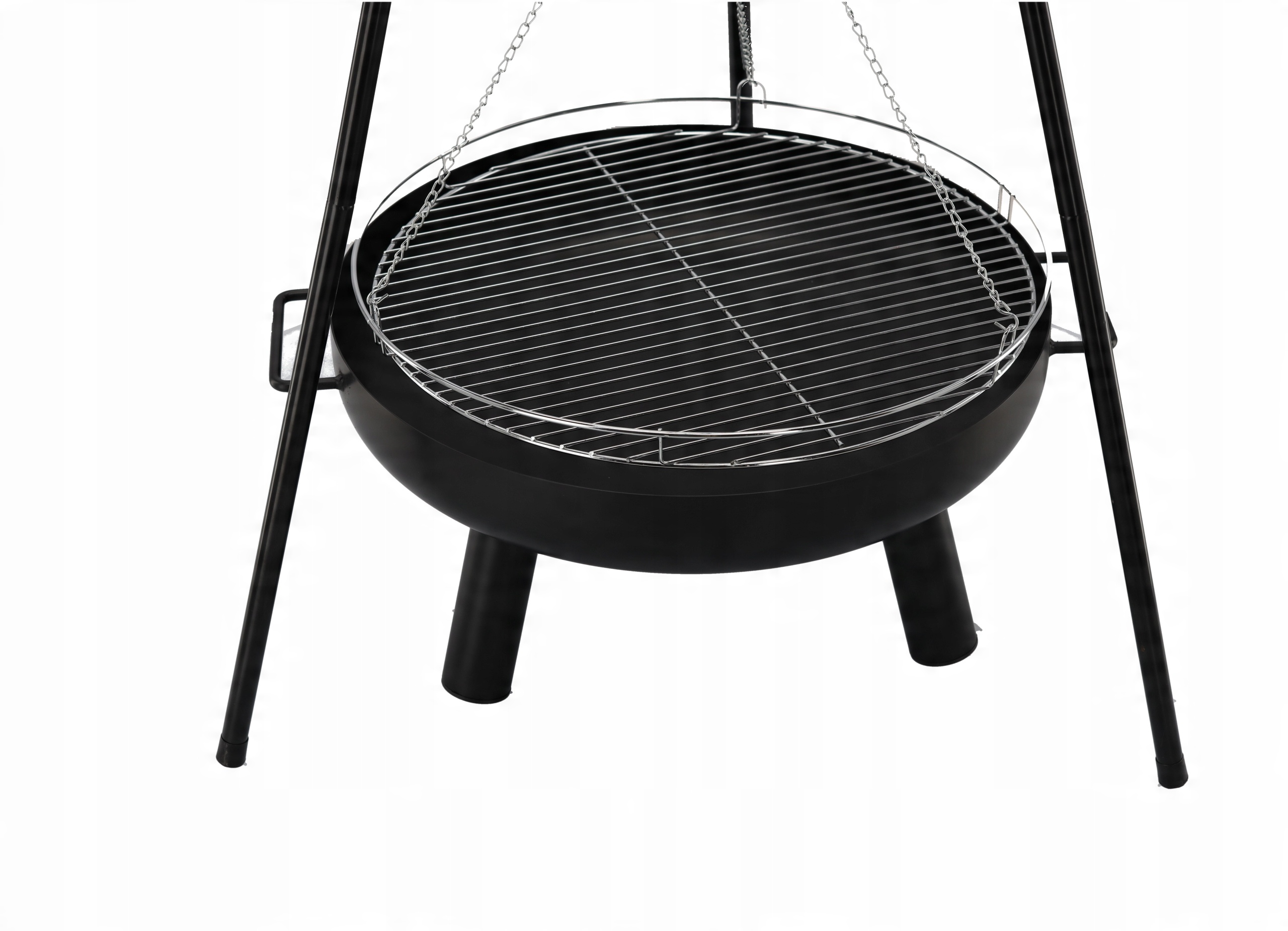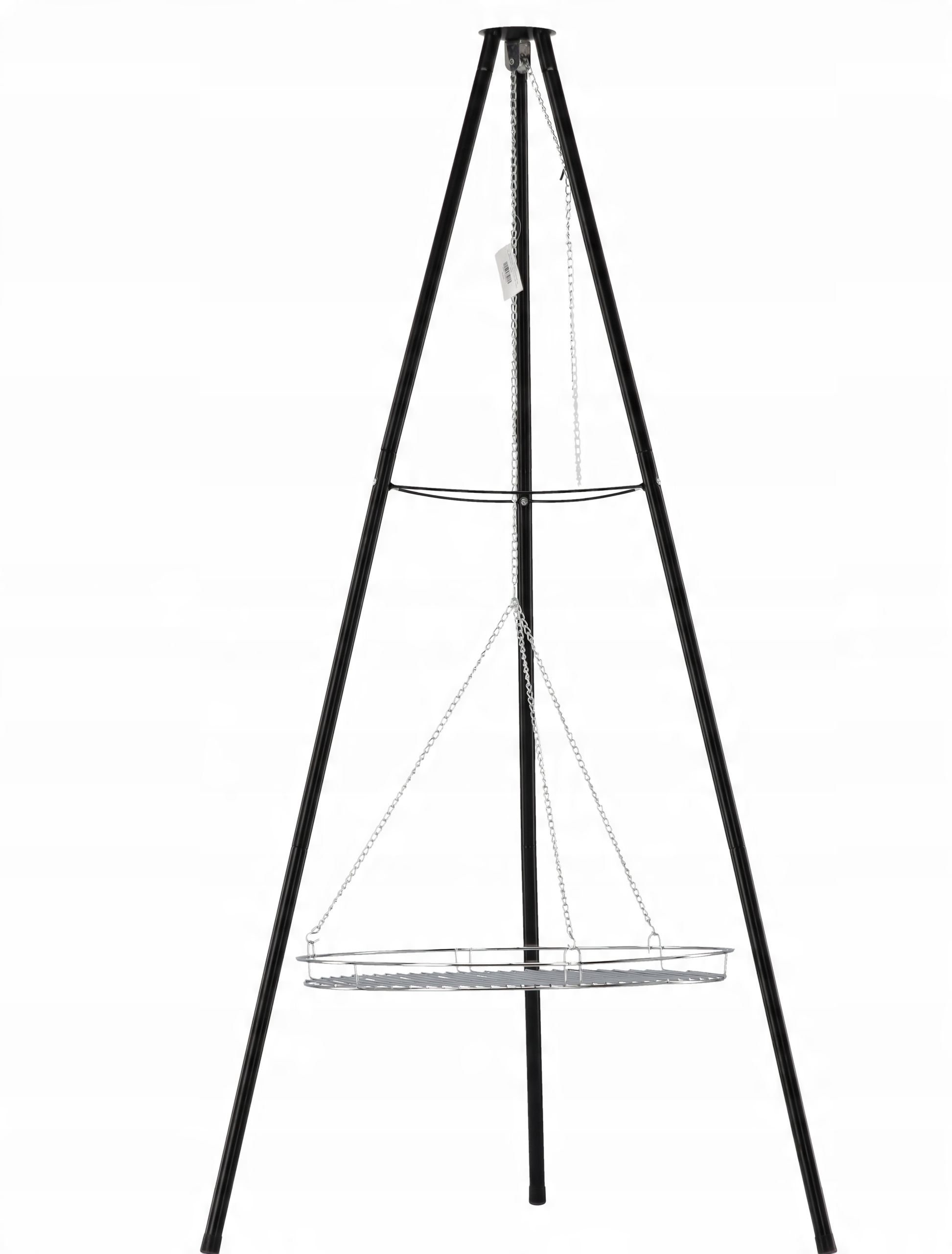 Підвісний гриль на тринозі з регульованою висотою, ідеальний для приготування барбекю на відкритому повітрі. Міцна конструкція та надійні матеріали забезпечують зручність використання та довговічність виробу.