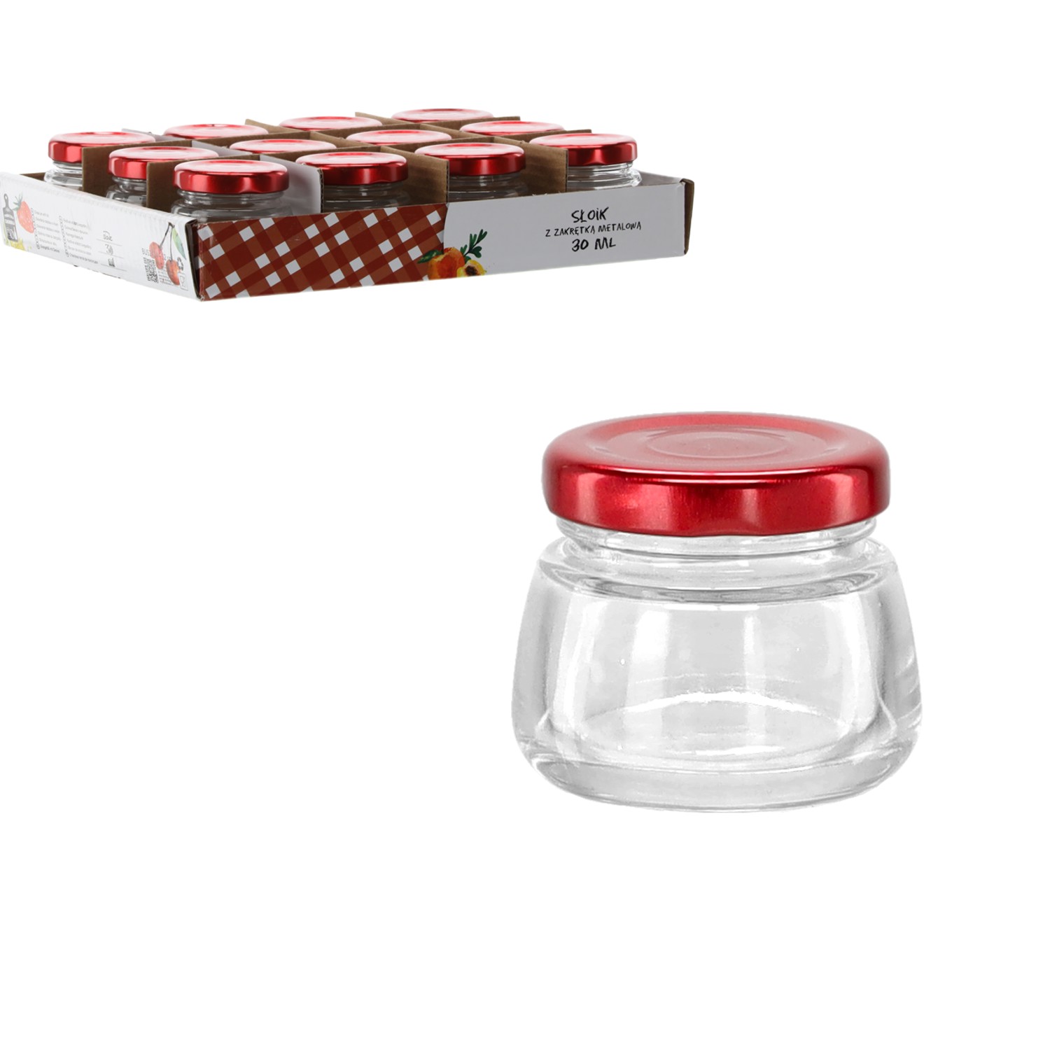 Склянка місткістю 30 мл, виготовлена з високоякісного скла, є ідеальним варіантом для зберігання меду, джемів, спецій та інших дрібних продуктів. Оснащена червоною металевою кришкою, вона забезпечує герметичність і свіжість зберігаються продуктів. Продукт упаковується на дисплеях по 12 штук, що полегшує презентацію та роздрібний продаж.