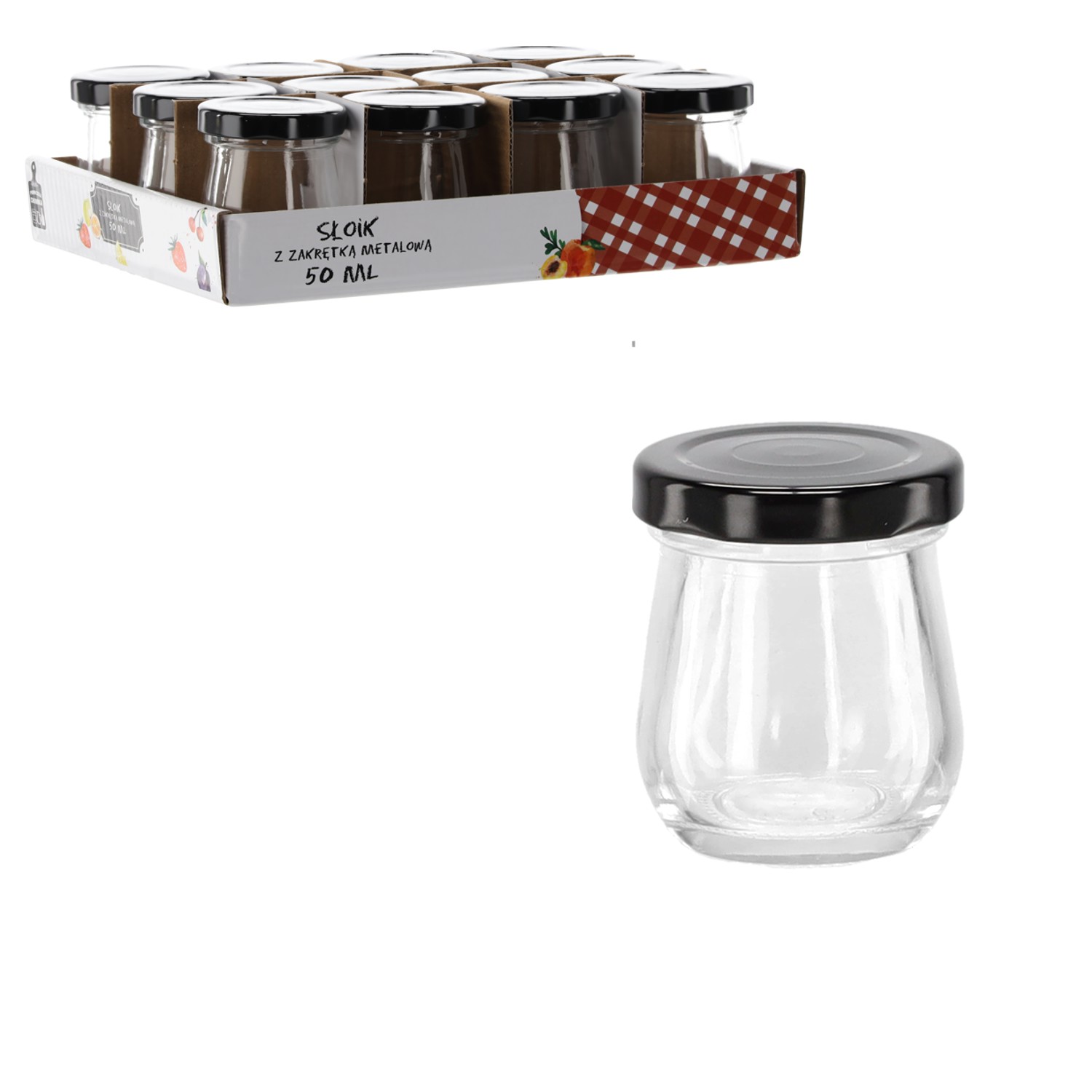 Склянка місткістю 50 мл – ідеальний варіант для зберігання меду, джему, спецій та інших дрібних продуктів. Оснащена чорною металевою кришкою, що забезпечує герметичність і свіжість продуктів, які в ній зберігаються. Продукт упакований в дисплеї по 12 штук, що полегшує презентацію та роздрібний продаж.