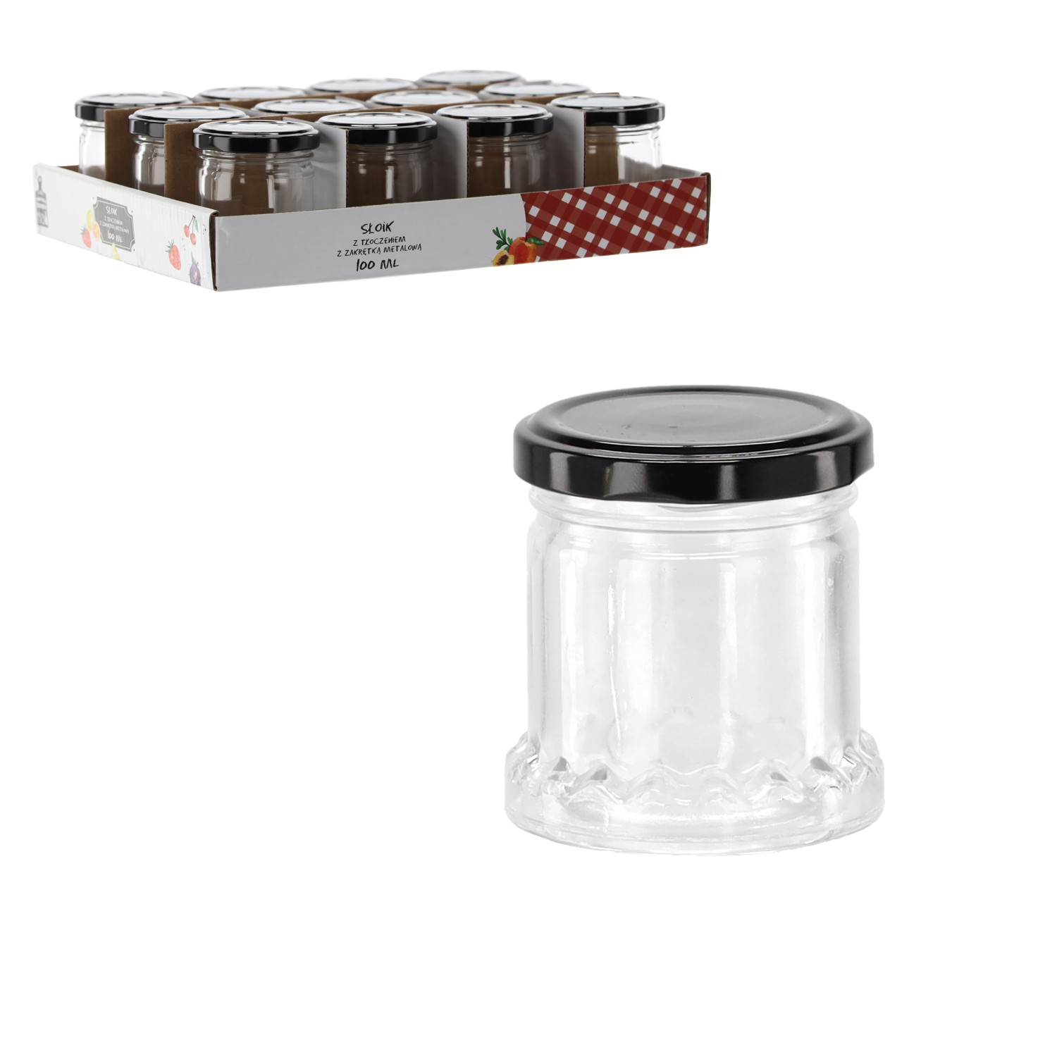 Склянка місткістю 100 мл, виготовлена з високоякісного скла, з елегантним тисненням, є ідеальним варіантом для зберігання меду, джемів, спецій та інших дрібних продуктів. Оснащена чорною металевою кришкою, що забезпечує герметичність і свіжість зберігаються продуктів. Склянка також підходить як декорація або подарунок. Продукт упакований в дисплеї по 12 штук, що полегшує презентацію та роздрібний продаж.
