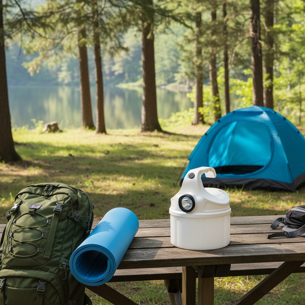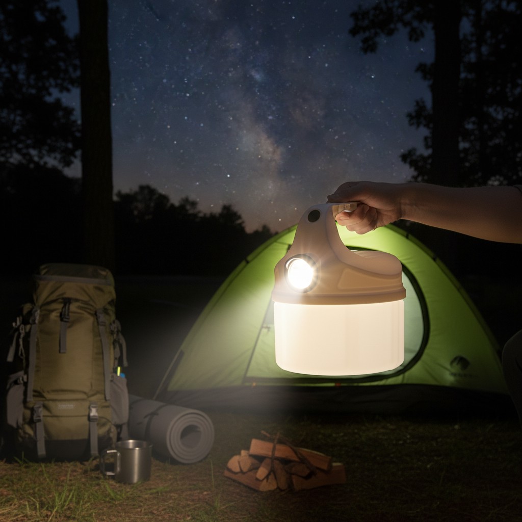 Універсальність, яка вам потрібна на природі! **Кемпінгова лампа 2 в 1 LED** пропонує два режими освітлення – переднє та нижнє світло, а також три функції освітлення: сильне, слабке та миготливе. Ідеально підходить для намету, саду, автомобіля або для виживання в дикій природі 🚗🌲