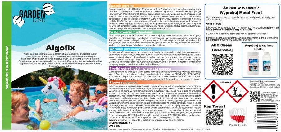 Циклічне дозування від 100-200 мл / 10 м3 раз на тиждень.Продукт призначений для дезінфекції, видалення та запобігання розвитку водоростей у басейнах, як внутрішніх, так і зовнішніх. Продукт ALGOFIX дозують безпосередньо в басейн ввечері , після закінчення купання або за допомогою автоматичних дозуючих систем. Рекомендовані дози:продукт маєбактерицидну та дріжджоцидну дію в концентрації 0,008% (80 г/1 м3 води), водоростецидну діюв концентрації 0,005% (50 г/1 м3 води) при контактіпротягом72 годин. Якщо вода в басейні має тенденцію до помутніння, дозу препарату слід збільшити на 50%. У разі великої кількості купальників, рясних опадівабо високих температур дозу слід збільшитивдвічі. Уникайте контакту з очима ,вдихання парів продукту та тривалого або багаторазового контакту зі шкірою.
