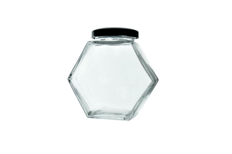 Склянка ємністю 180 мл шестикутної форми, ідеально підходить для зберігання меду, джемів, спецій та інших дрібних продуктів. Оснащена герметичною кришкою, що забезпечує свіжість продуктів, які в ній зберігаються. Продукт упакований в дисплей по 12 штук, що полегшує презентацію та роздрібний продаж.