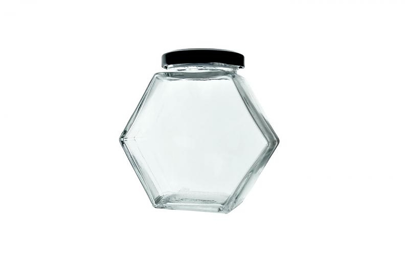 Склянка ємністю 180 мл шестикутної форми, ідеально підходить для зберігання меду, джемів, спецій та інших дрібних продуктів. Оснащена герметичною кришкою, що забезпечує свіжість зберіганих продуктів. Продукт упакований в дисплей по 12 штук, що полегшує презентацію та роздрібний продаж.