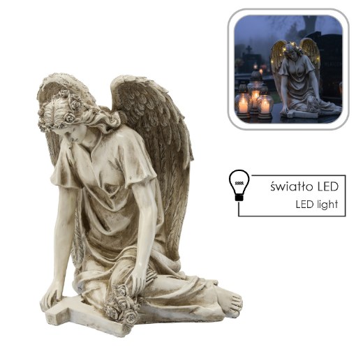 Фігура, що зображує ангела, що сидить з хрестом і букетом, з вінком на голові, прикрашеним світлодіодами. Виконана в бежевих тонах, ідеально підходить для прикраси могили – символ спокою і пам'яті.