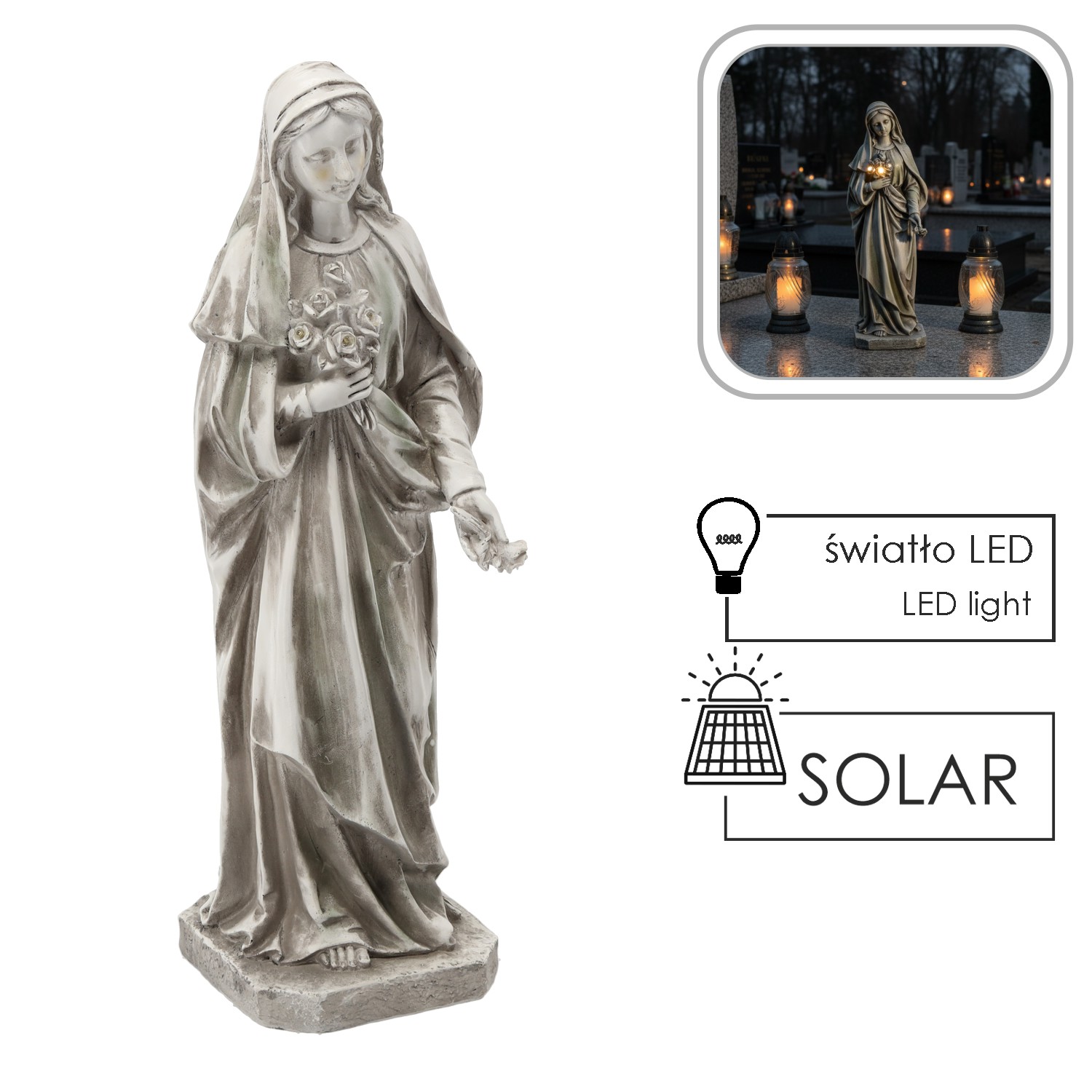 Фігура Святої Марії, що тримає букет, прикрашений витонченими світлодіодами. Виконана в елегантному бежевому відтінку, поєднує в собі класичну витонченість і сучасний світловий акцент. Ідеально підходить для інтер'єру або на кладовище, символізуючи віру і спокій.