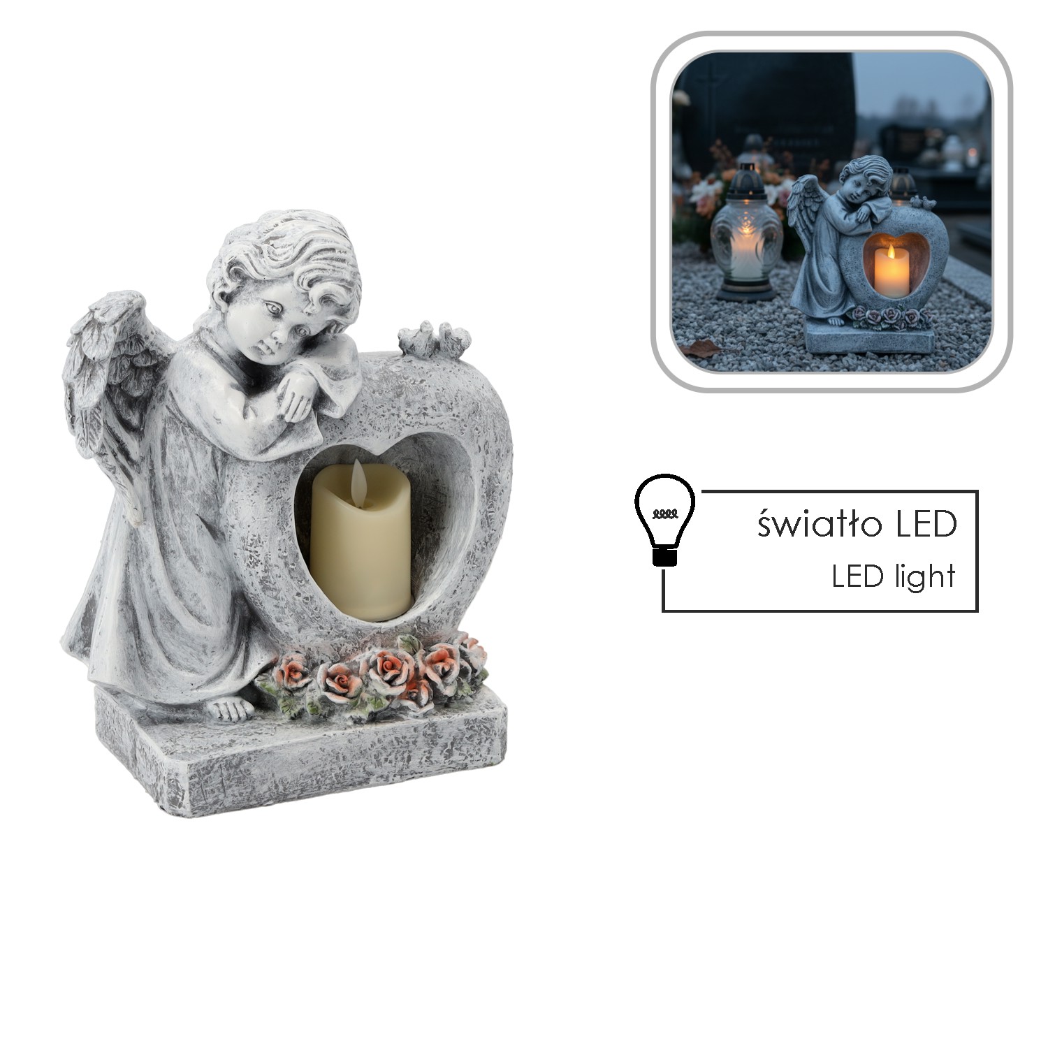 Фігурка, що зображує ангела, який спирається на серце, в якому знаходиться світлодіодна свічка. На серці сидять крихітні голубки, що символізують мир і любов. Виконана в ніжних відтінках сірого, ідеально підходить для створення теплої, задумливої атмосфери.