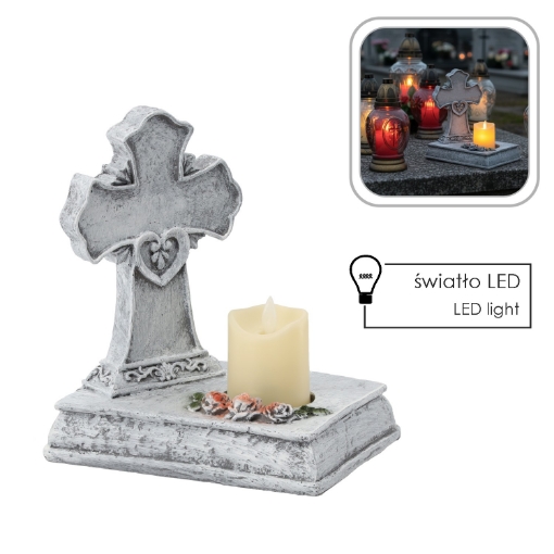 Фігура хреста зі свічкою LED, розміщена на елегантній підставці з поглибленням для свічки. Виконана в простому, але стильному дизайні, ідеально підходить для прикраси могили, створюючи атмосферу спокою і задуми.