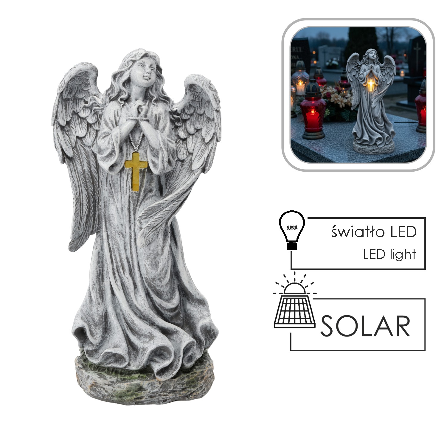 Делікатна фігура ангела зі складеними руками, в яких він тримає хрестик LED. Виконана в ніжних сірих тонах, ідеально підходить для прикраси кладовища, символізуючи молитву і духовну рефлексію.