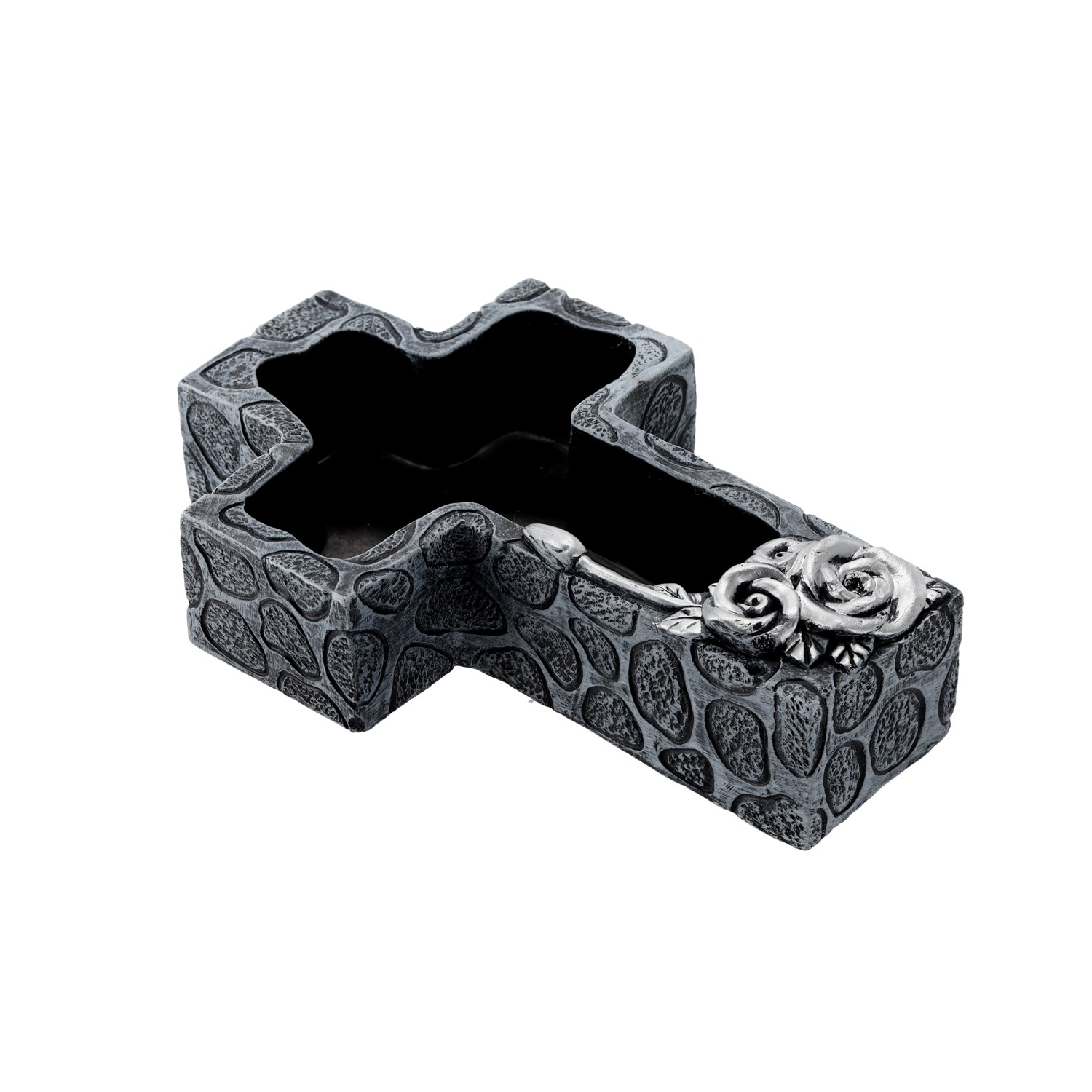 Ретельно виготовлена вазон/кашпо у формі хреста, прикрашена золотими квітковими деталями. Ідеально підходить як основа для надгробних композицій, яка з гідністю підкреслить пам'ять про близьких. Виготовлена з цементу темно-сірого кольору з золотими акцентами.