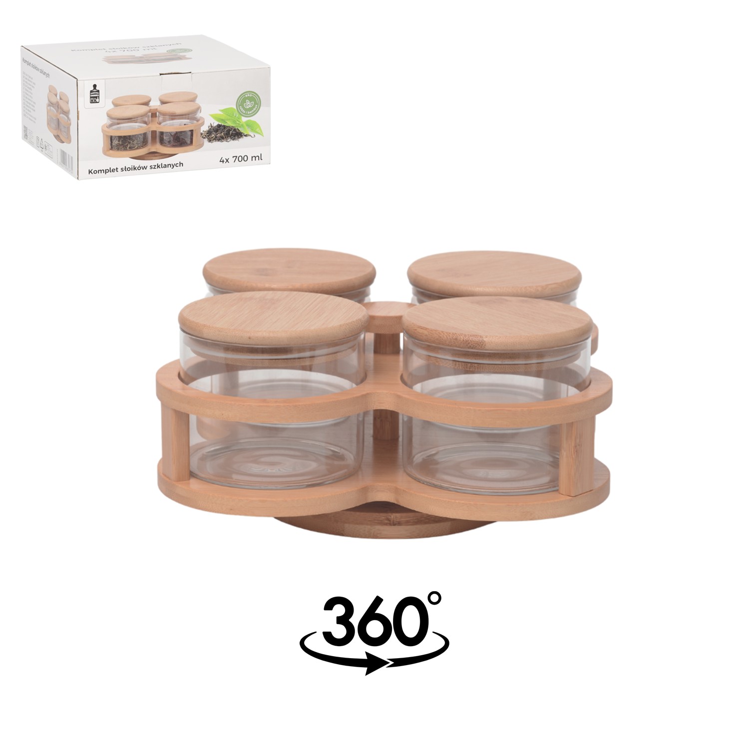 Набір 4 скляних банок місткістю 700 мл, кожна з яких оснащена дерев'яною кришкою. Склянки встановлені на дерев'яній підставці, що забезпечує стабільність і елегантний вигляд. Відмінно підходять для зберігання меду, джемів, спецій та інших дрібних продуктів. Ідеально підходять для використання на кухні, в коморі або як прикраса на столі.