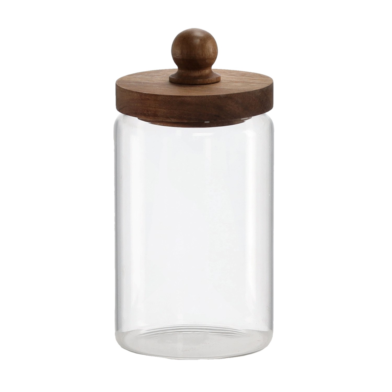 Скляна банка місткістю 800 мл – це практичне та елегантне рішення для зберігання меду, джемів, спецій та інших дрібних продуктів. Оснащена дерев'яною кришкою. У комплекті ложка, що забезпечує легкий доступ до продуктів, що зберігаються. Ідеально підходить для використання на кухні як функціональний та декоративний елемент.