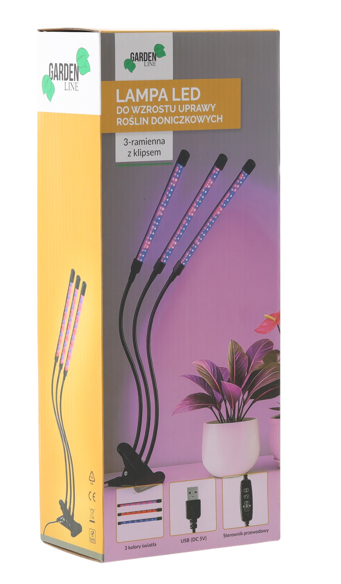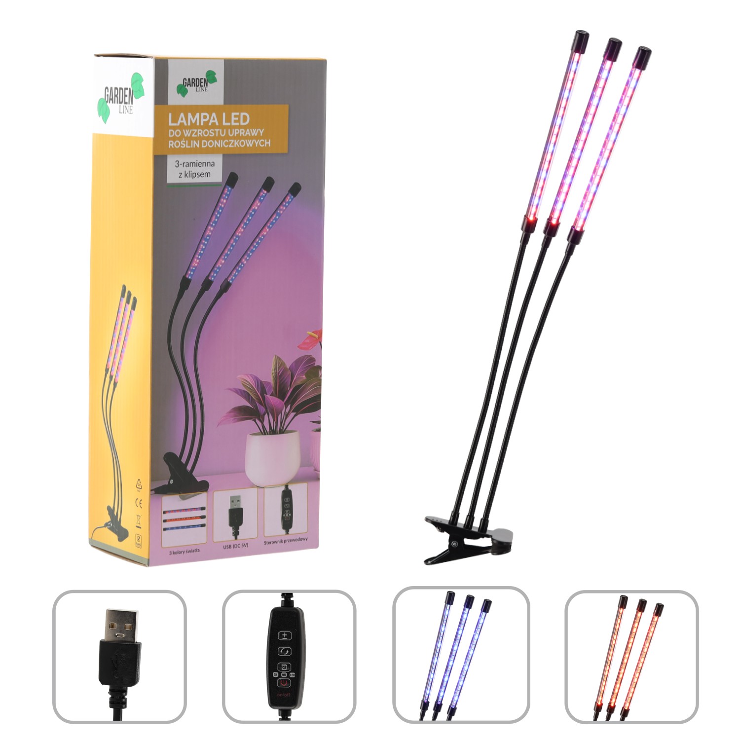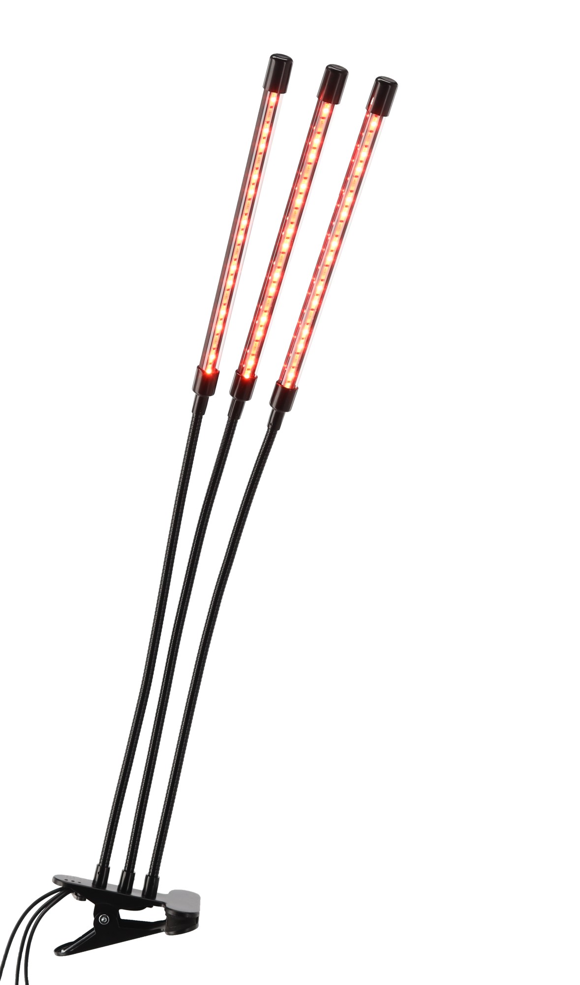 Живлення: USB (DC 5V)Таймер: 3, 9 або 12 годинРежими освітлення: червоний / синій / рожевий (червоний + синій)Світлодіоди (на головці): 13× червоні + 7× синіДовжина хвиль:Синій: 450 нмЧервоне: 620 нмРожеве: 450 нм + 620 нмПараметри фотосинтезу (потік фотонів – мкмоль/с): Червоне світло: 4,9 мкмоль/с Синє світло: 3,5 мкмоль/с Рожеве світло (змішане): 7,5 мкмоль/с