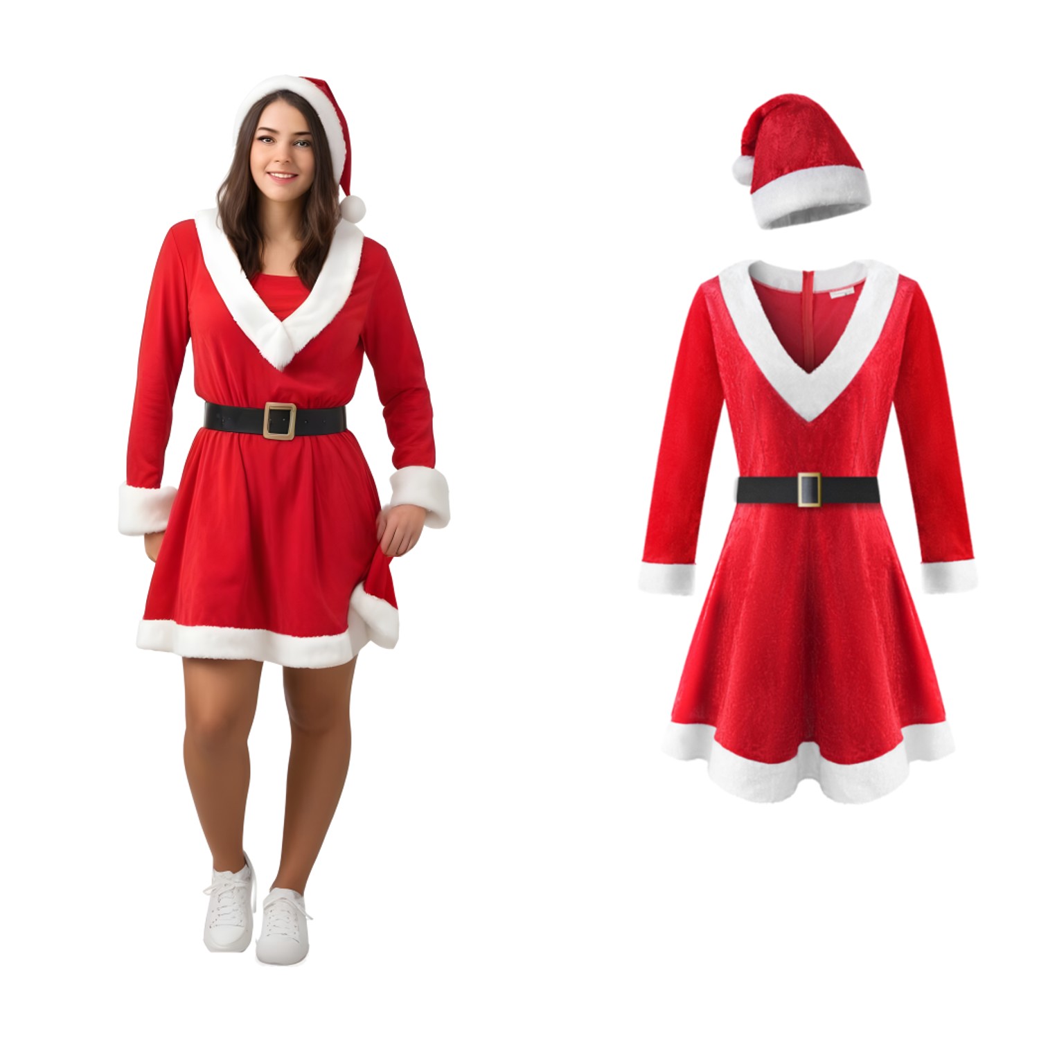 Комплект містить сукню, шапку Міколая та ремінь, які разом створюють цілісний і веселий образ 🎄. Костюм зручний і легкий в одяганні, завдяки чому кожна жінка може відчути себе частиною святкової казки 🌟.