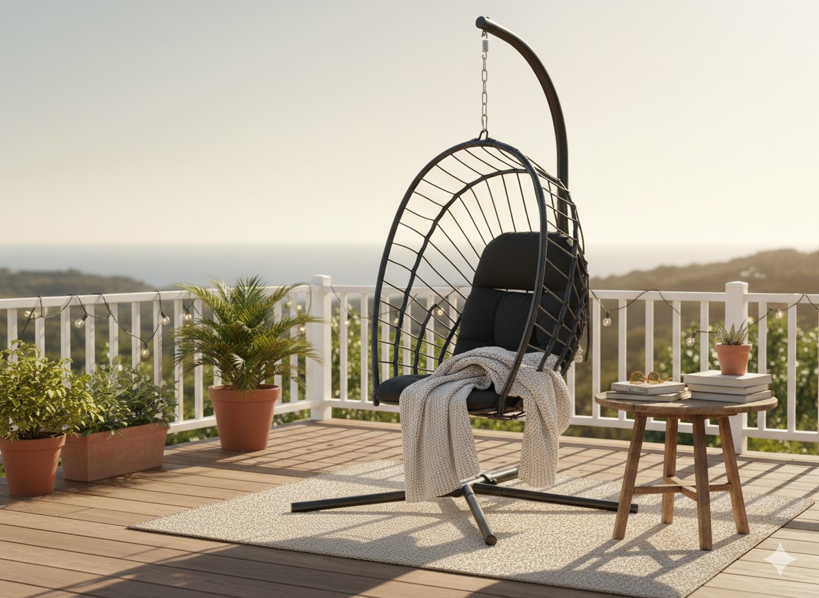 Мінімалістичний дизайн, практична форма і максимальний комфорт - познайомтеся з підвісним кріслом ERIS в складаній версії! Все в елегантному чорному кольорі, який впишеться в будь-яке оточення - від сучасної тераси до затишного балкона.