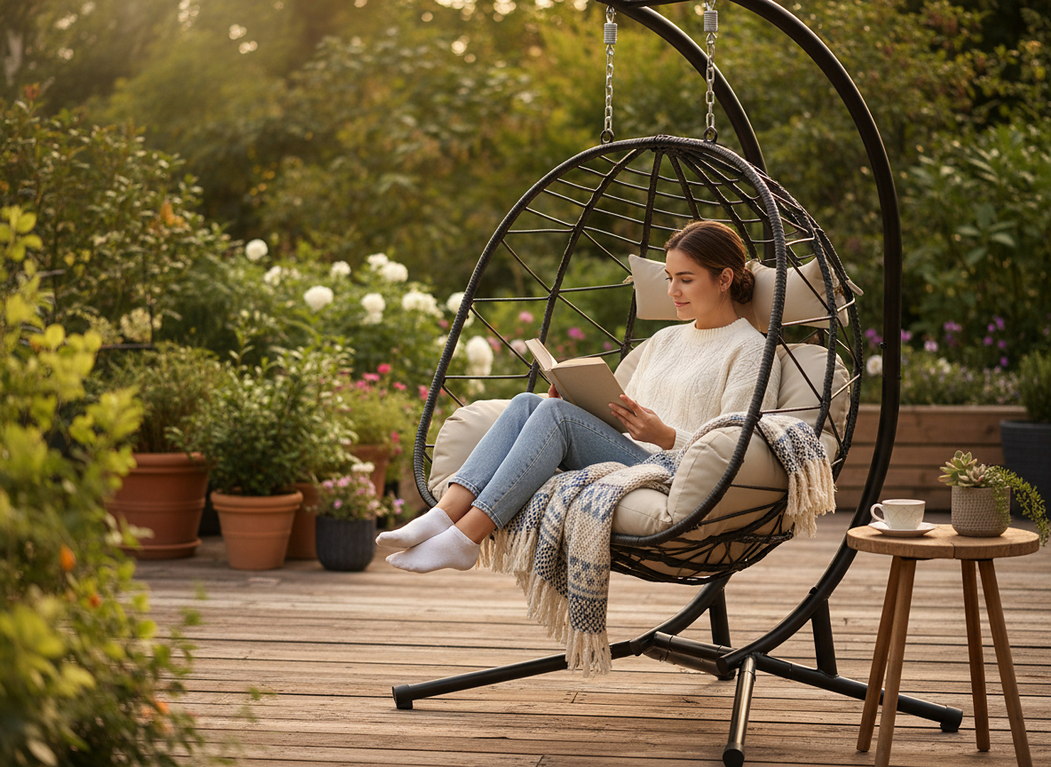 Він вражає мінімалістичним дизайном, міцною конструкцією та затишною світло-сірою подушкою. Це не просто меблі — це стильний притулок для відпочинку на будь-яку пору року 🌿