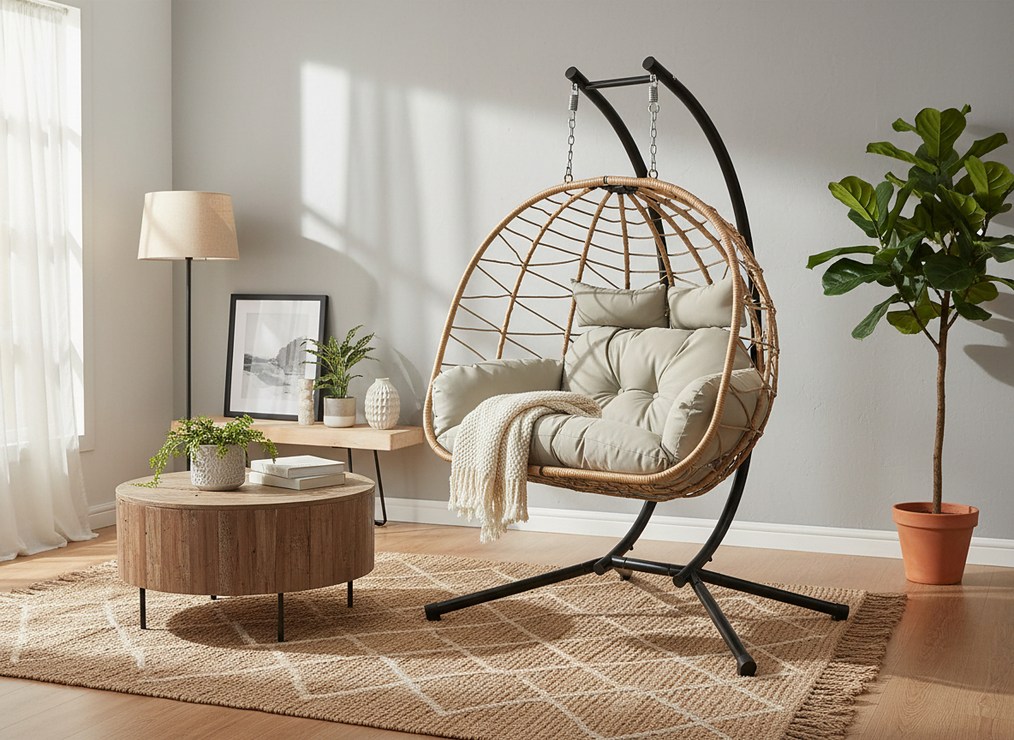 Завдяки складаній конструкції та стабільній чорній рамі з порошкового фарбованої сталі, LUVO чудово підійде як для зовнішнього, так і для внутрішнього використання. Це не просто меблі, це центр відпочинку у вашому домі або саду 🌿