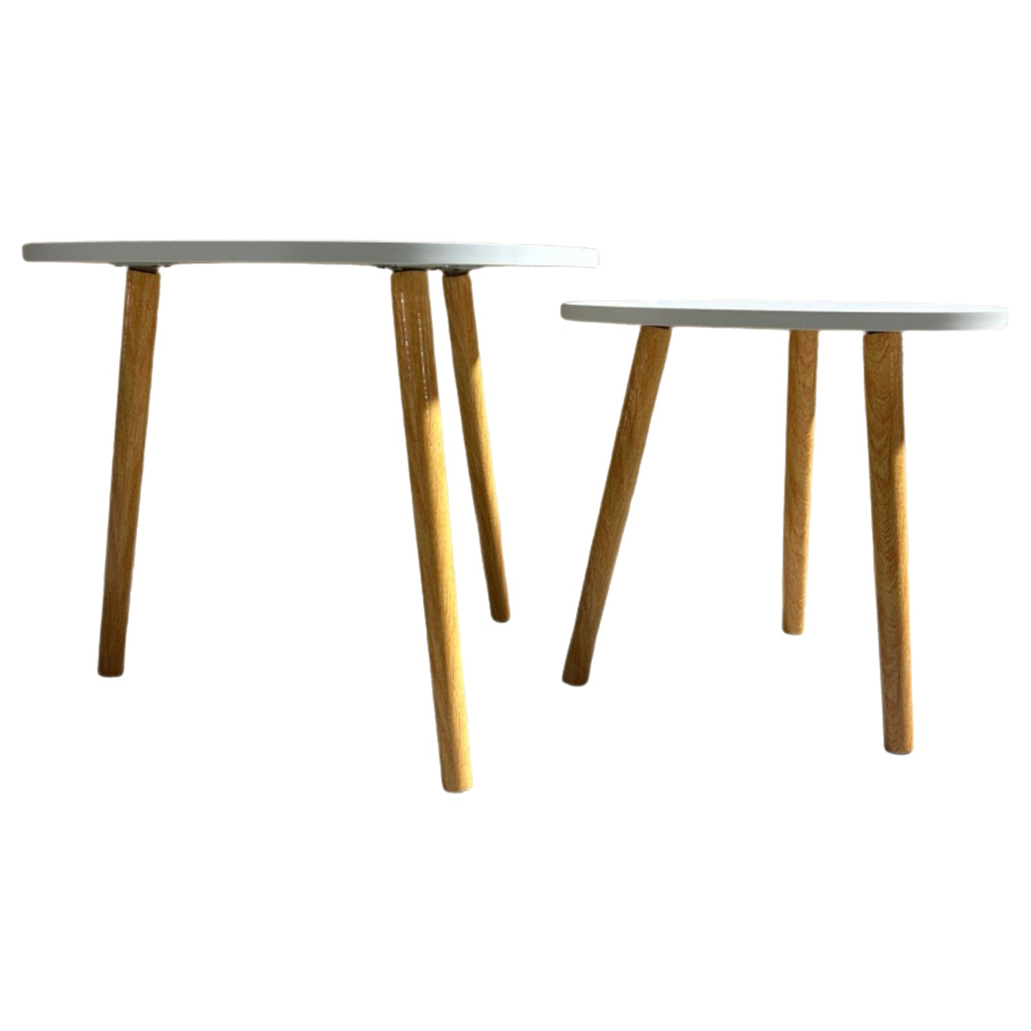 🌿 Стильний комплект з двох журнальних столиків сучасного дизайну та легкого скандинавського характеру – ідеальне рішення для будь-якого інтер'єру. ✨ Нерегулярна трикутна форма стільниць із заокругленими кутами надає їм оригінальності, а поєднання білого кольору з натуральним деревом вносить гармонію та тепло в простір. 🌞