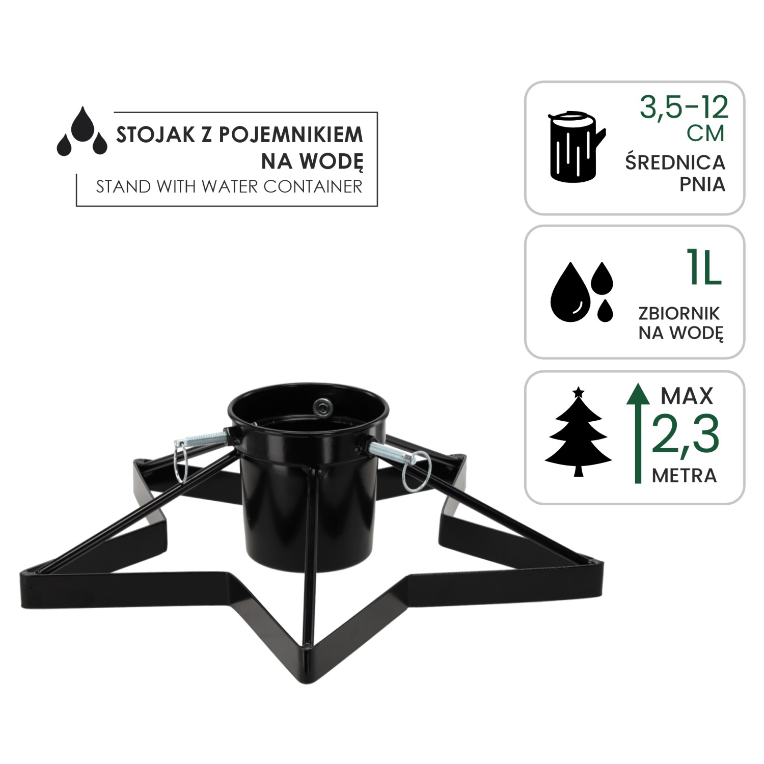 • Стабільна металева конструкція – гарантує безпечне утримання ялинки висотою до 2,3 м.
