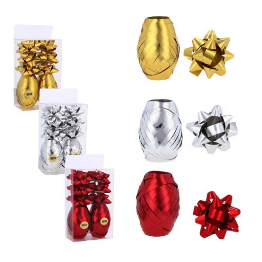 Набір для пакування подарунків. Набір містить стрічку довжиною 20 м і шириною 5 мм та 6 штук бантиків розміром 6 см. Значно полегшує пакування подарунків, завдяки чому вони виглядають дуже естетично.