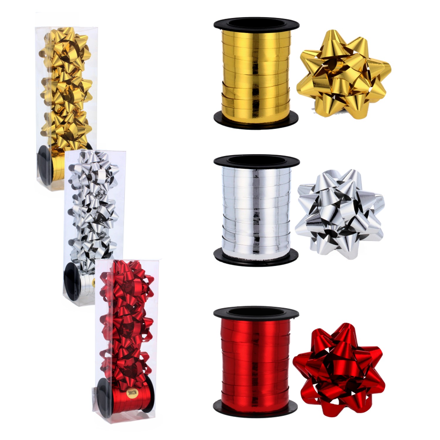 Набір для пакування подарунків. Набір містить: 2 стрічки довжиною 20 м і шириною 5 мм та 6 штук бантиків розміром 6 см. Значно полегшує пакування подарунків, завдяки чому вони виглядають дуже естетично.