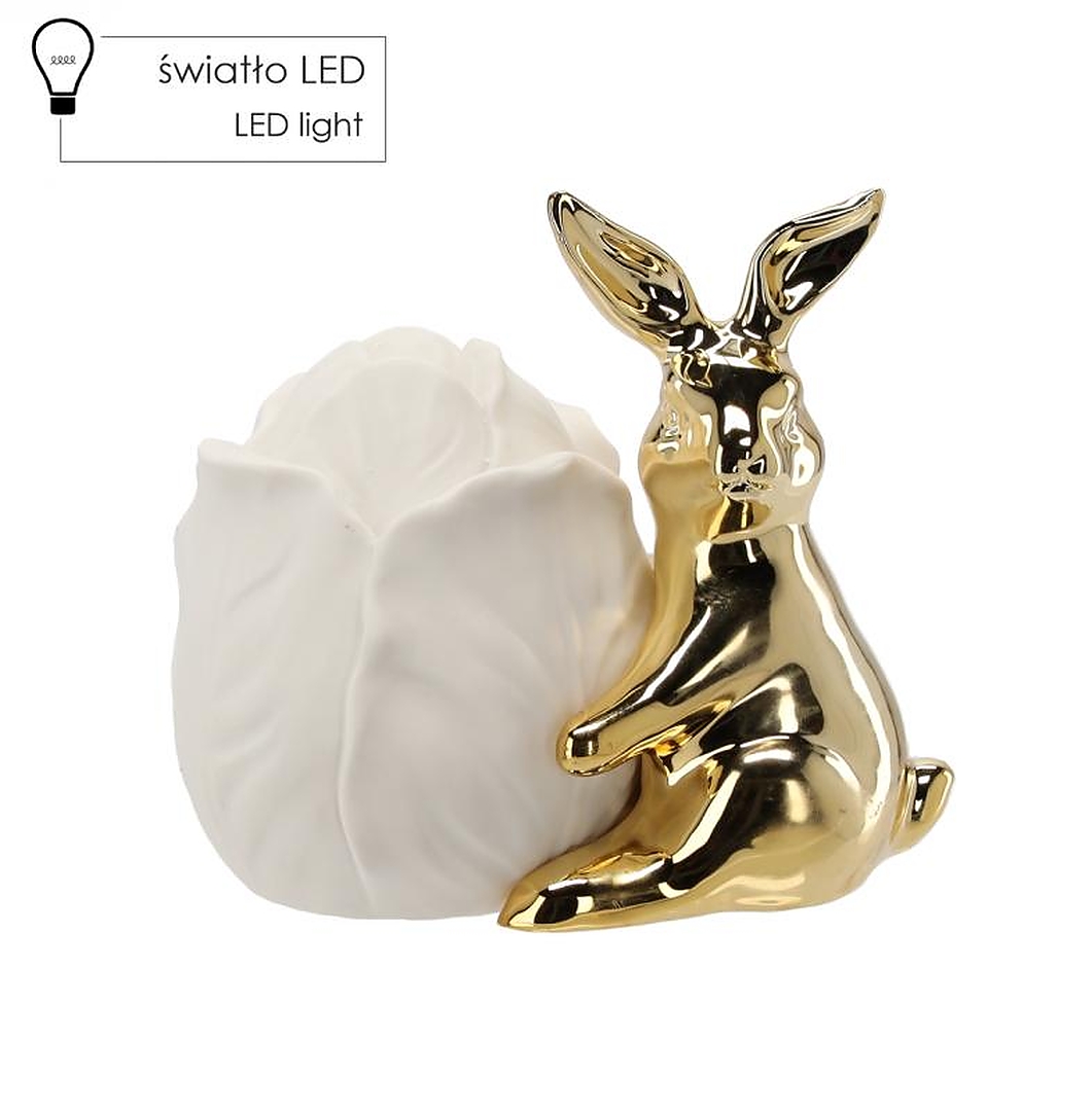 Прикрасьте свій будинок на Великдень елегантною фігуркою зайчика, виготовленою з високоякісної кераміки. Цей чарівний золотий зайчик з ніжним квіточкою - ідеальний вибір для весняної декорації. Його витончений, блискучий колір додасть блиску будь-якому інтер'єру. Заєць оснащений функцією LED, яка додасть вашій оселі атмосферного світла, створюючи теплу атмосферу під час Великодня.