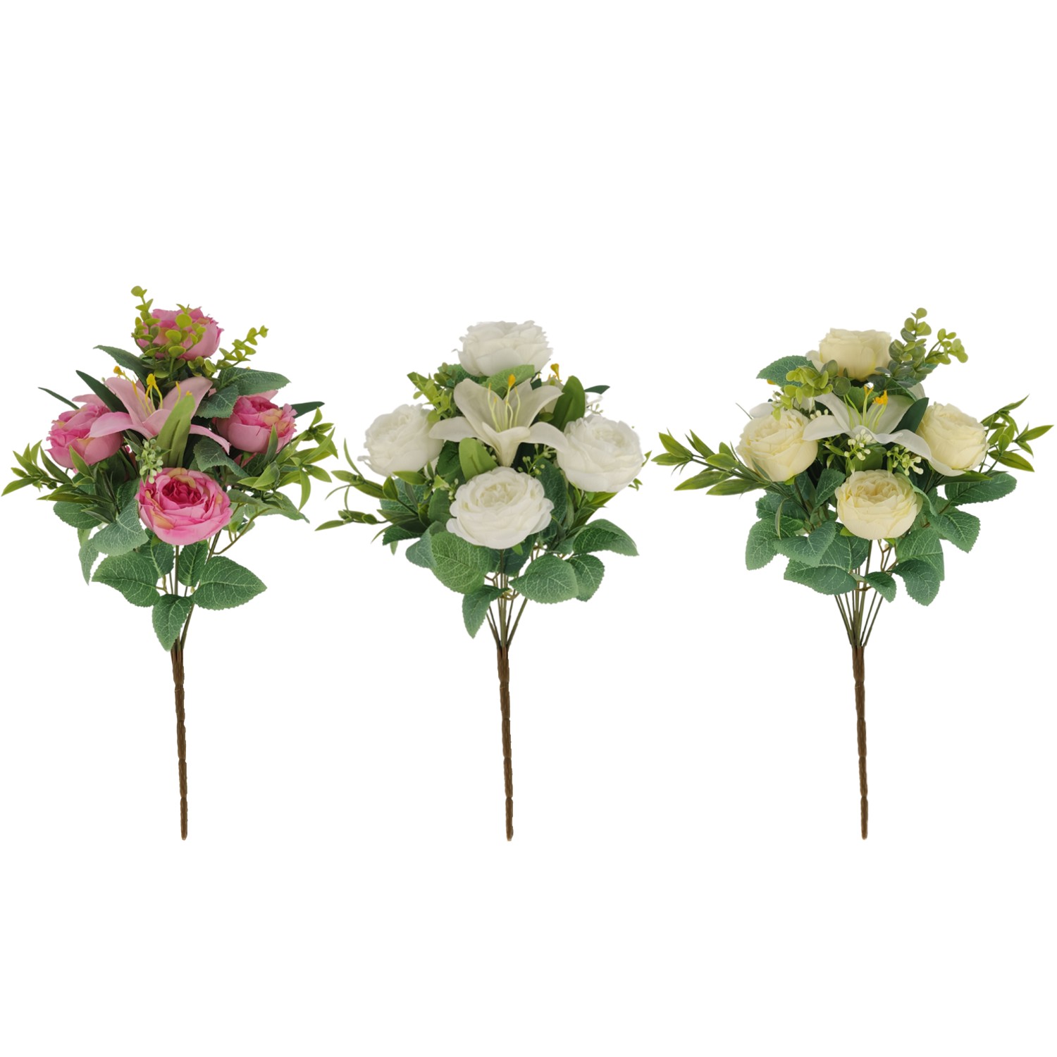 7 квіток, діаметр 7 см3 лілії, 9,5 см10 листя, 7 травВисота: 43 смКольори: білий, жовтий і рожевий.