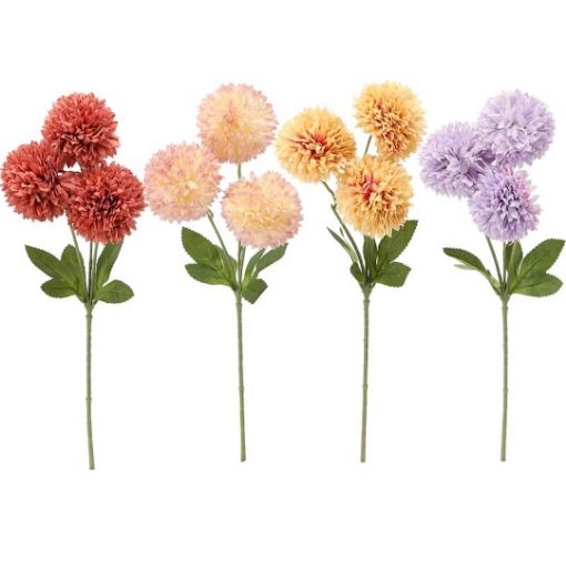 Ефектна декорація, натхненна пишними, пухнастими квітами жоржин. Гілка висотою 43 см складається з 3 пишних квітів, які вражають багатством пелюсток та інтенсивними кольорами 🌿