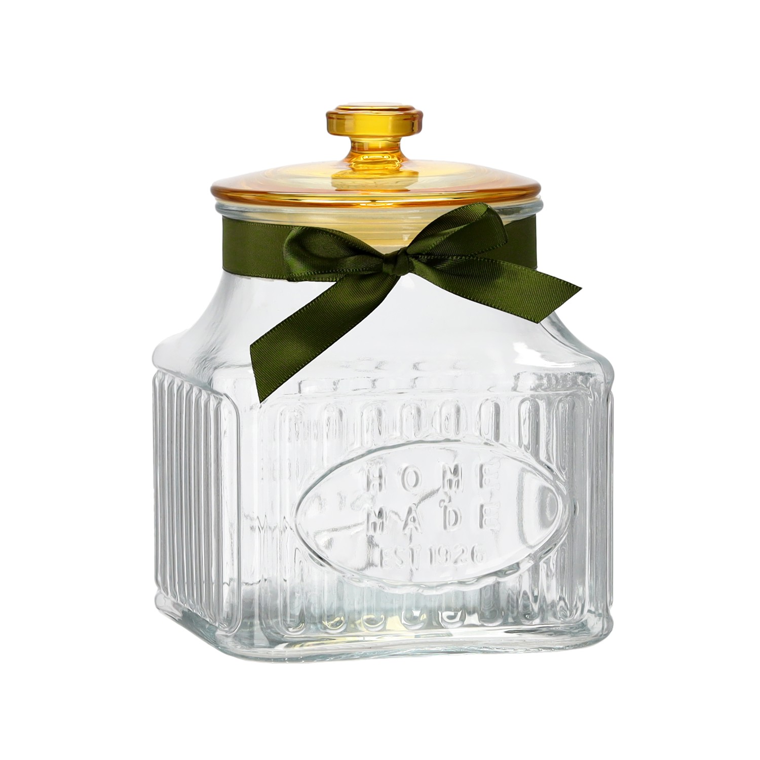 Скляна банка місткістю 2,4 л квадратної форми з елегантними смужками, оснащена скляною золотою кришкою з стрічкою. Ідеально підходить для зберігання меду, джемів, спецій та інших харчових продуктів. Золота кришка та стрічка надають йому елегантного та декоративного характеру, завдяки чому він ідеально підходить як подарунок або як прикраса для кухні та комори.