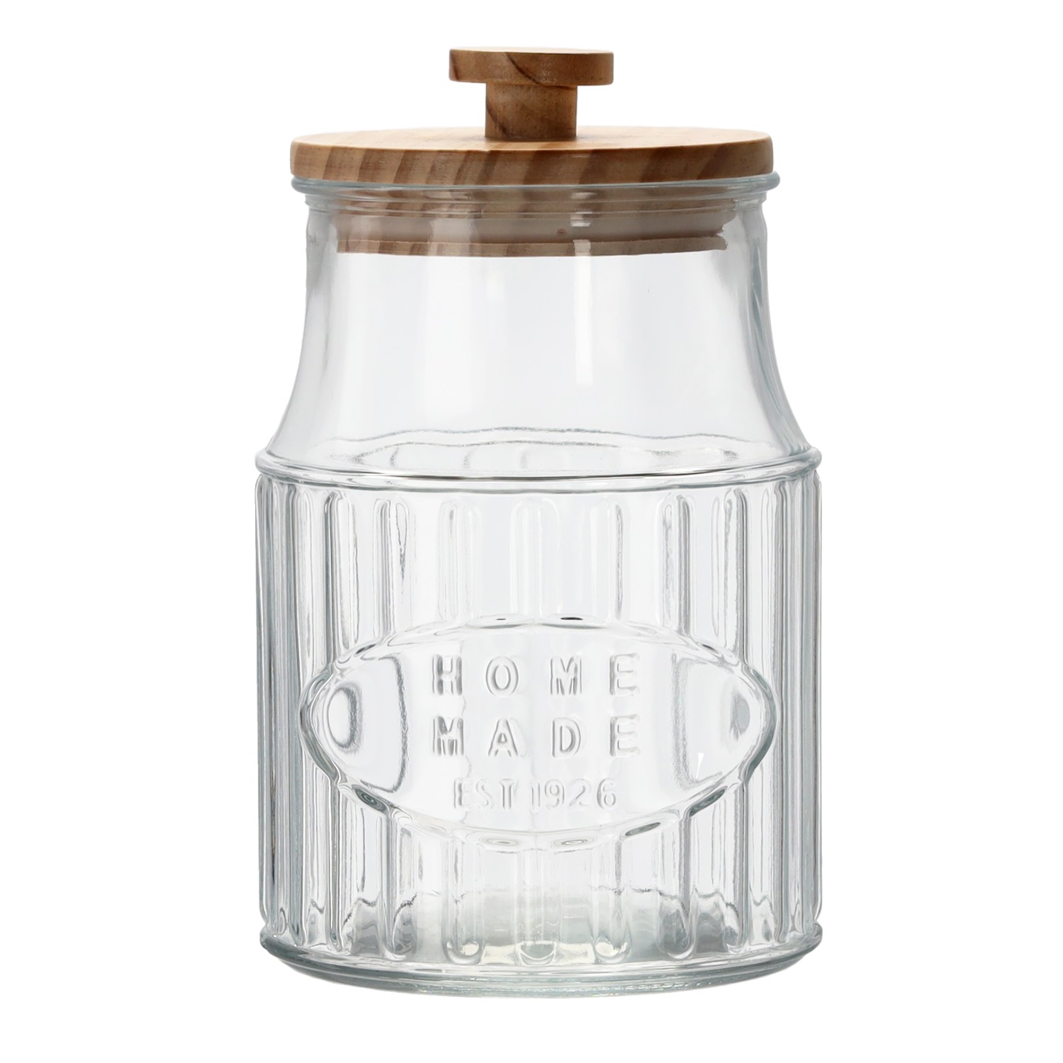 Скляна банка об'ємом 2,6 л, виготовлена у формі круглої форми з елегантними смужками, є ідеальним варіантом для зберігання консервів, меду, джемів, спецій та інших харчових продуктів. Оснащений дерев'яною кришкою, він забезпечує герметичність і свіжість продуктів, що зберігаються. Його класичний дизайн з смужками робить його ідеальним для будь-якої кухні або комори.