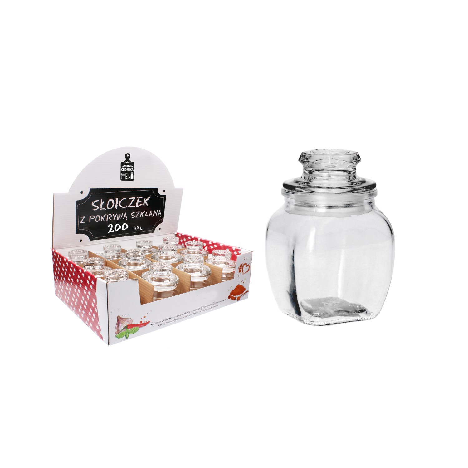 Скляна банка об'ємом 200 мл круглої форми, оснащена скляною кришкою, є ідеальним варіантом для зберігання меду, джемів, спецій та інших дрібних продуктів. Банка відрізняється простим, елегантним дизайном і ідеально підходить для використання на кухні, в коморі або як декоративний елемент. Продукт упакований в дисплей по 12 штук, що полегшує презентацію і роздрібну торгівлю.