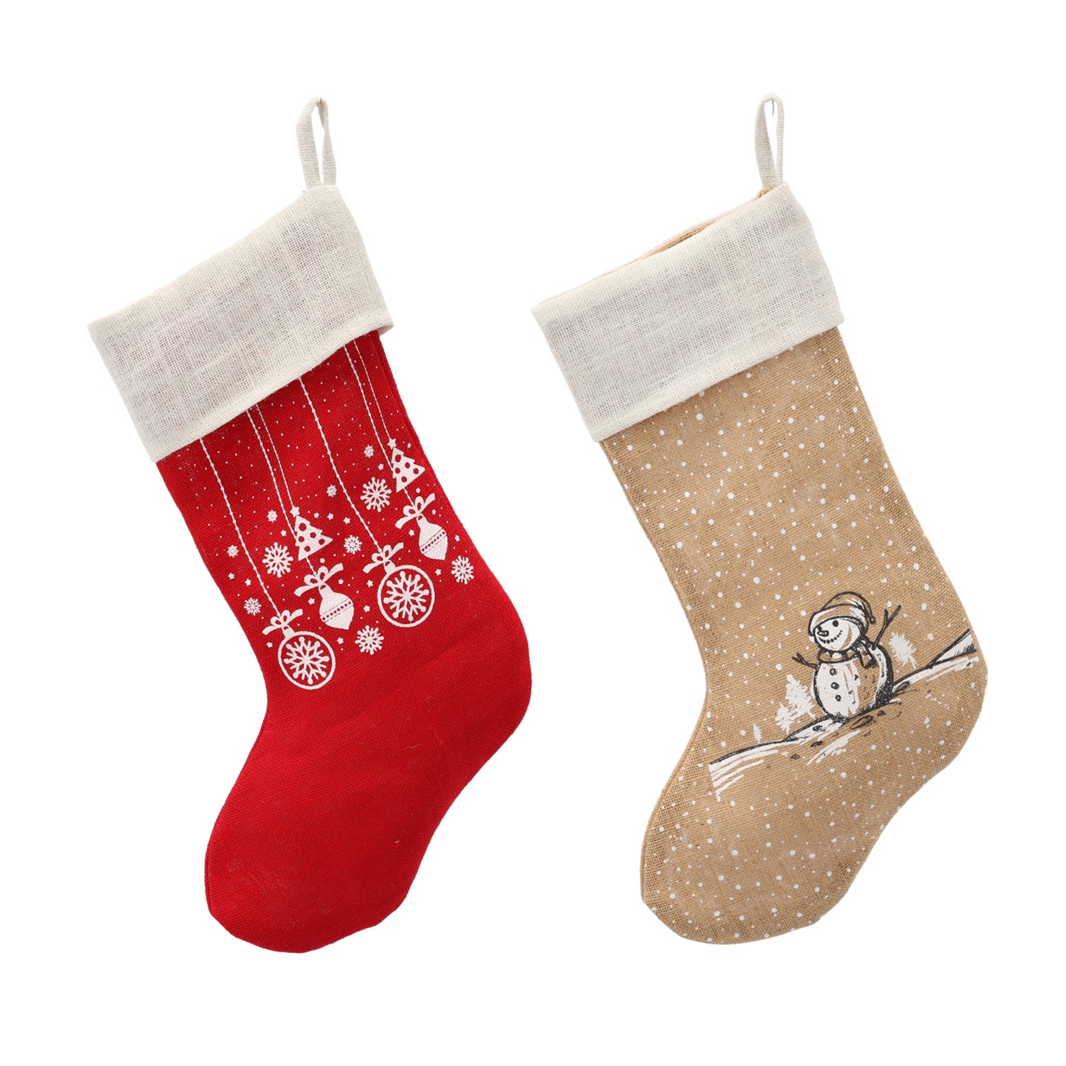 Різдвяна шкарпетка з джуту. На вибір два дизайни: червона з білими кульками або бежева з сніговиком і сніжинками. Ідеально підходить для різдвяного декору будинку або офісних приміщень на роботі.Розміри: 51 x 20 см