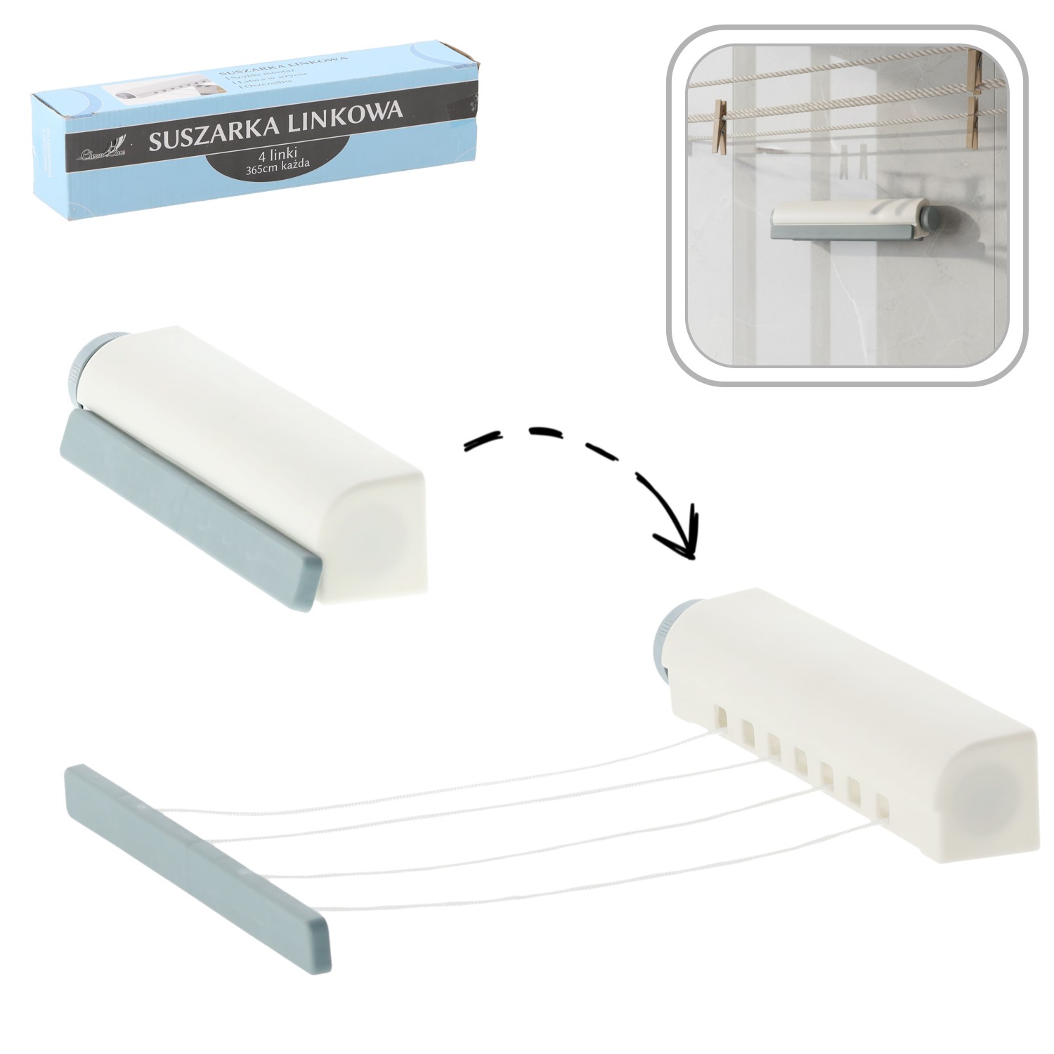 Випрані речі повинні мати своє місце для сушіння. Якщо у нас маленька ванна кімната або ми їдемо у відпустку, то нам знадобиться практична і зручна сушарка для білизни, яку можна автоматично згортати. Вона є ідеальним рішенням для будь-яких вузьких приміщень. Її також можна використовувати на балконі. Сушарку слід монтувати на будь-яких стінах, відстань між якими не перевищує 360 см. У комплекті є 4 мотузки з регульованою довжиною – кожна до 360 см, що дає в цілому понад 14 м площі для одноразового сушіння. Сушарка надзвичайно проста і швидка в монтажі, а в складеному вигляді займає мало місця.