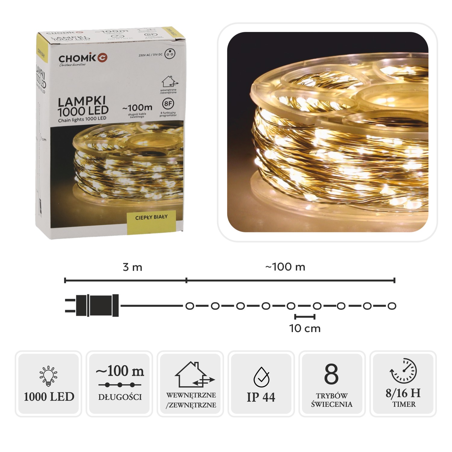> кількість діодів: 1000L> колір діодів: теплий білий > загальна довжина: ~ 103 м> довжина світлової частини: ~ 100 м> довжина кабелю живлення: 3 м> кабель з мікродіодами LED перерізом 0,15 мм2> колір ізоляції: срібний > клас герметичності: IP44> 8-функціональний програматор з функцією пам'яті та таймером 8/16 год> відстань між діодами: 10 см> вторинна номінальна напруга: 31 В> первинна напруга: 230 В