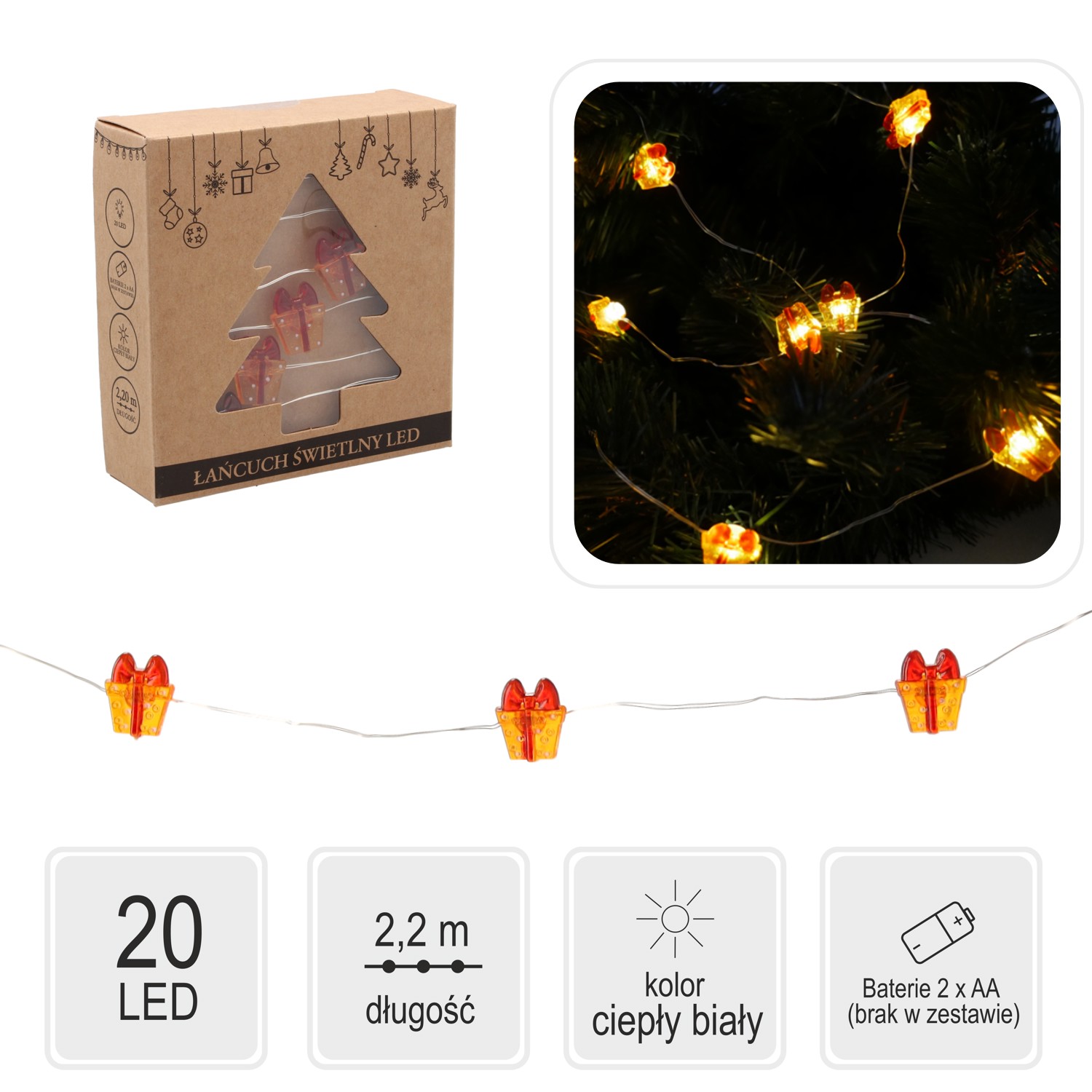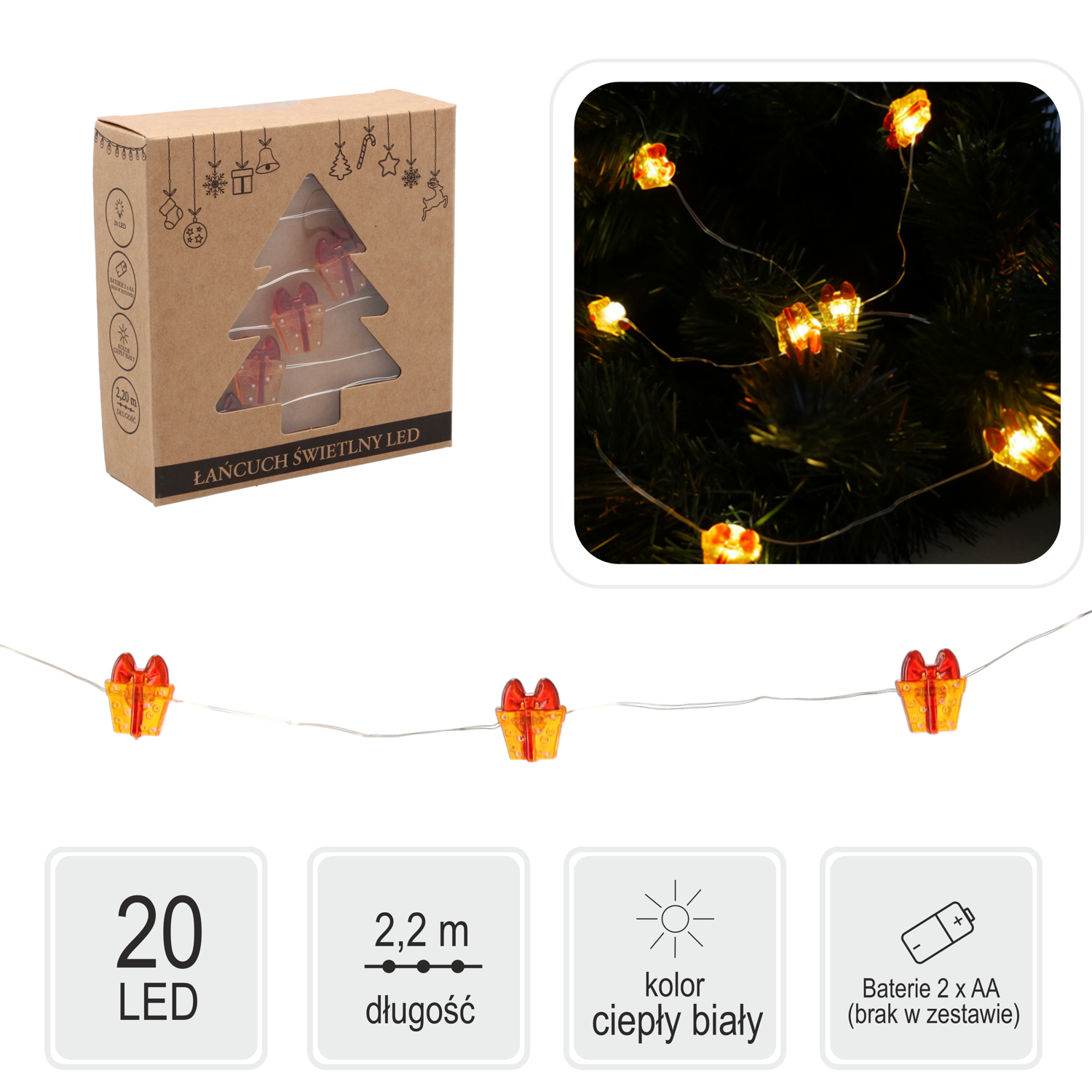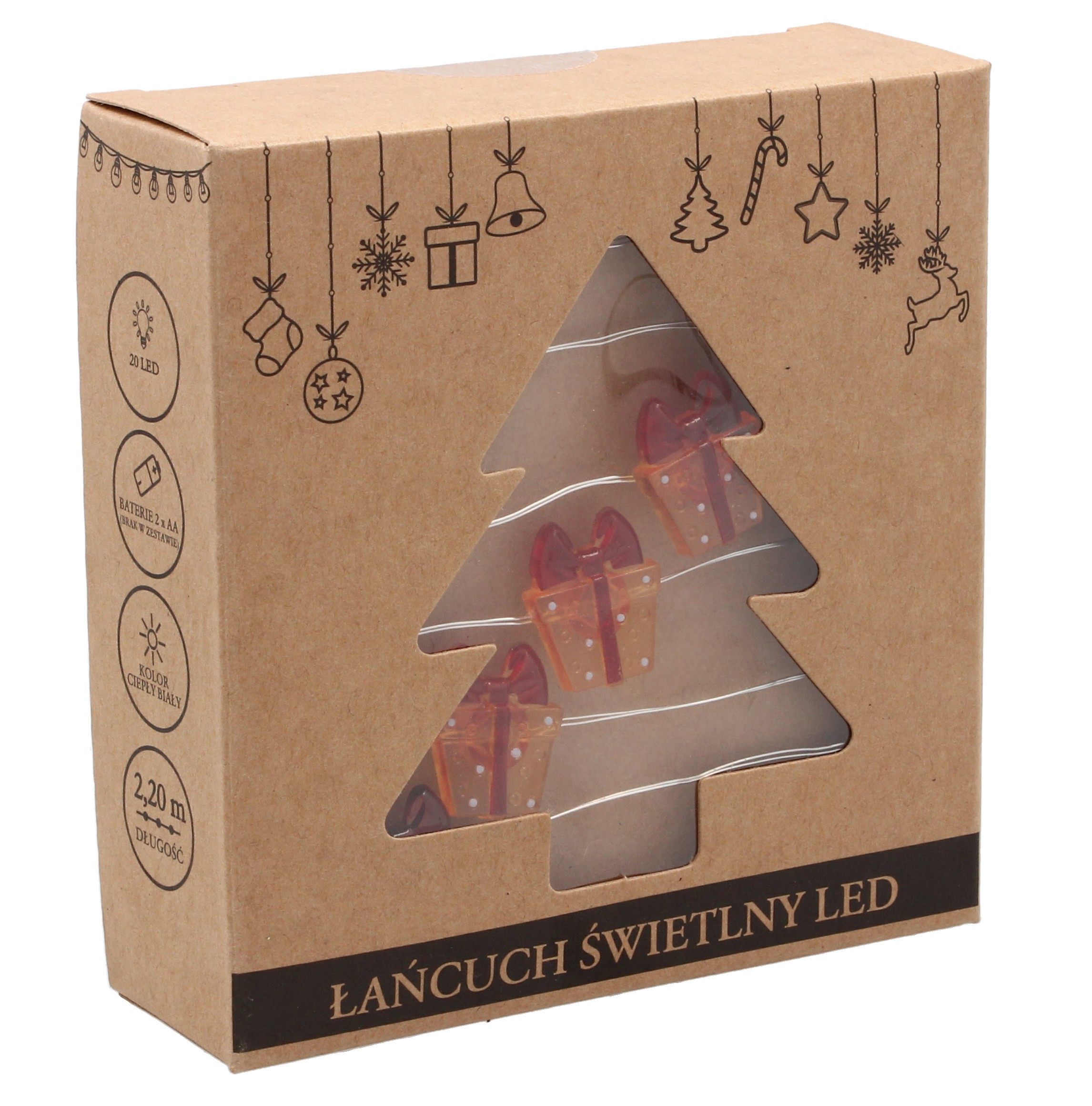 Освітліть свята чарівною світлодіодною гірляндою у формі подарунків! Цей чарівний аксесуар з 20 світлодіодами теплого білого кольору — ідеальна прикраса для ялинки, полиці, віночка або вікна. Без кабелів, без проблем — працює на батарейках і може бути розміщений буквально де завгодно 🎄