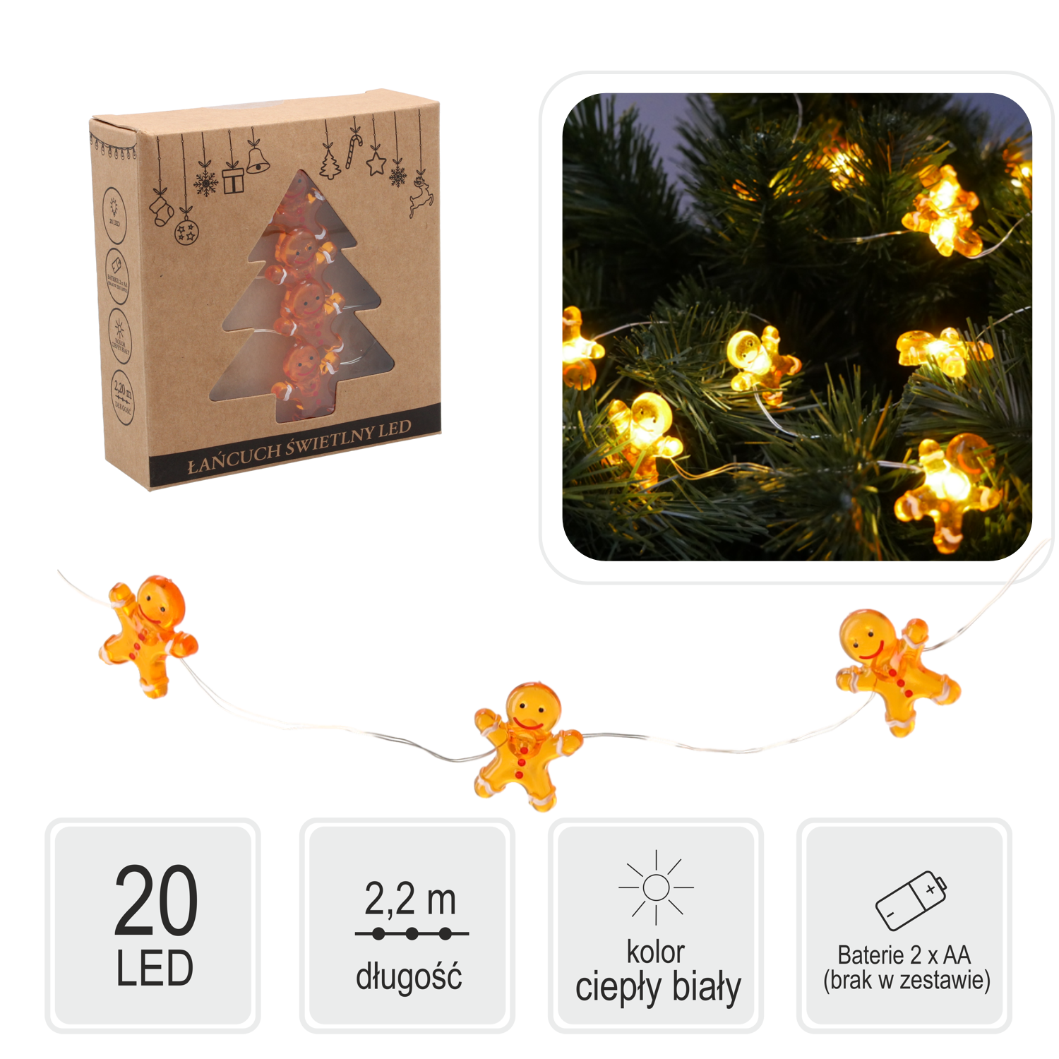Солодка прикраса, яка осяє Ваші свята! 🎄 Світлодіодна гірлянда з чарівними пряниковими чоловічками – ідеальний додаток до ялинки, полиці або святкової композиції. 20 теплих світлодіодів створюють затишну атмосферу, сповнену радості та домашнього тепла.