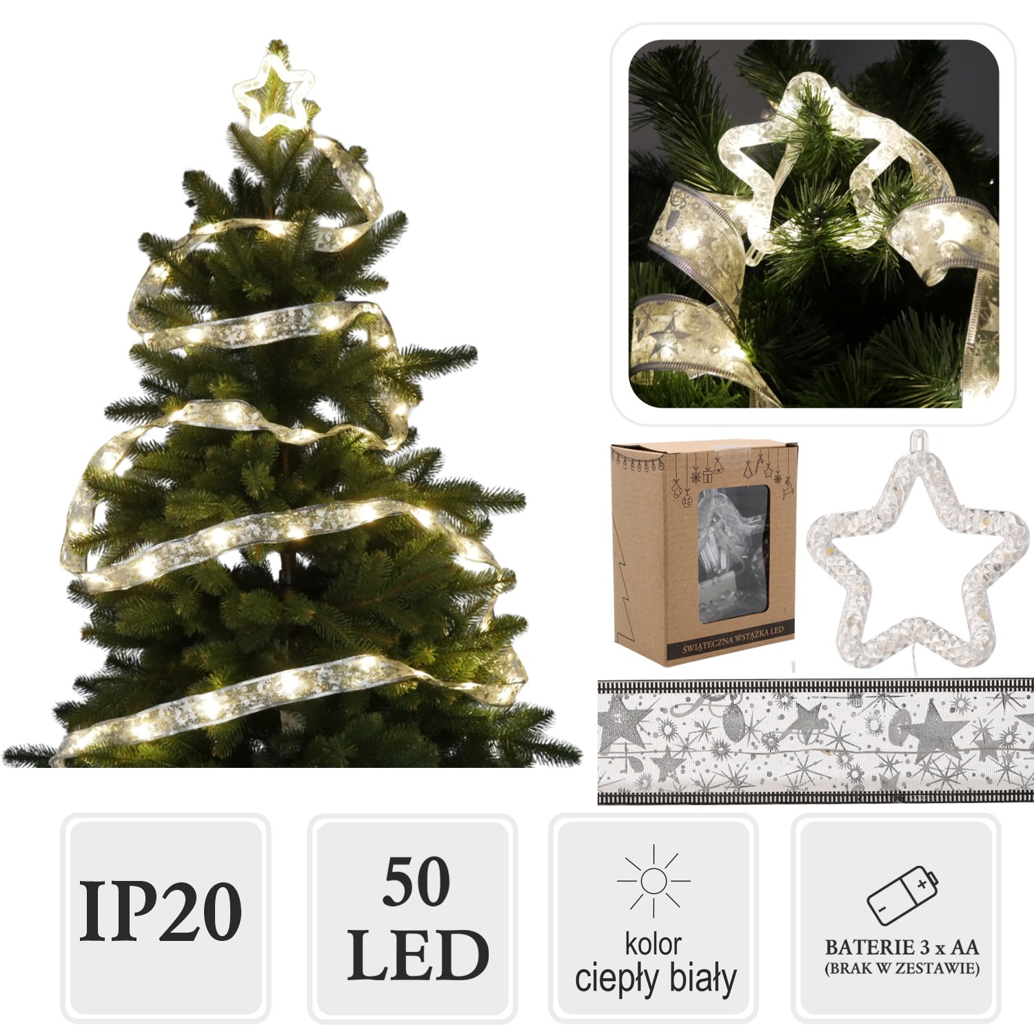 Створіть теплу, чарівну атмосферу на своїй ялинці або у святковому куточку завдяки срібній стрічці LED з ефектною зіркою на верхівці. З 50 світлодіодами теплого білого кольору ця прикраса ідеально підкреслить красу ялинки та додасть блиску вашому інтер'єру ✨🎄