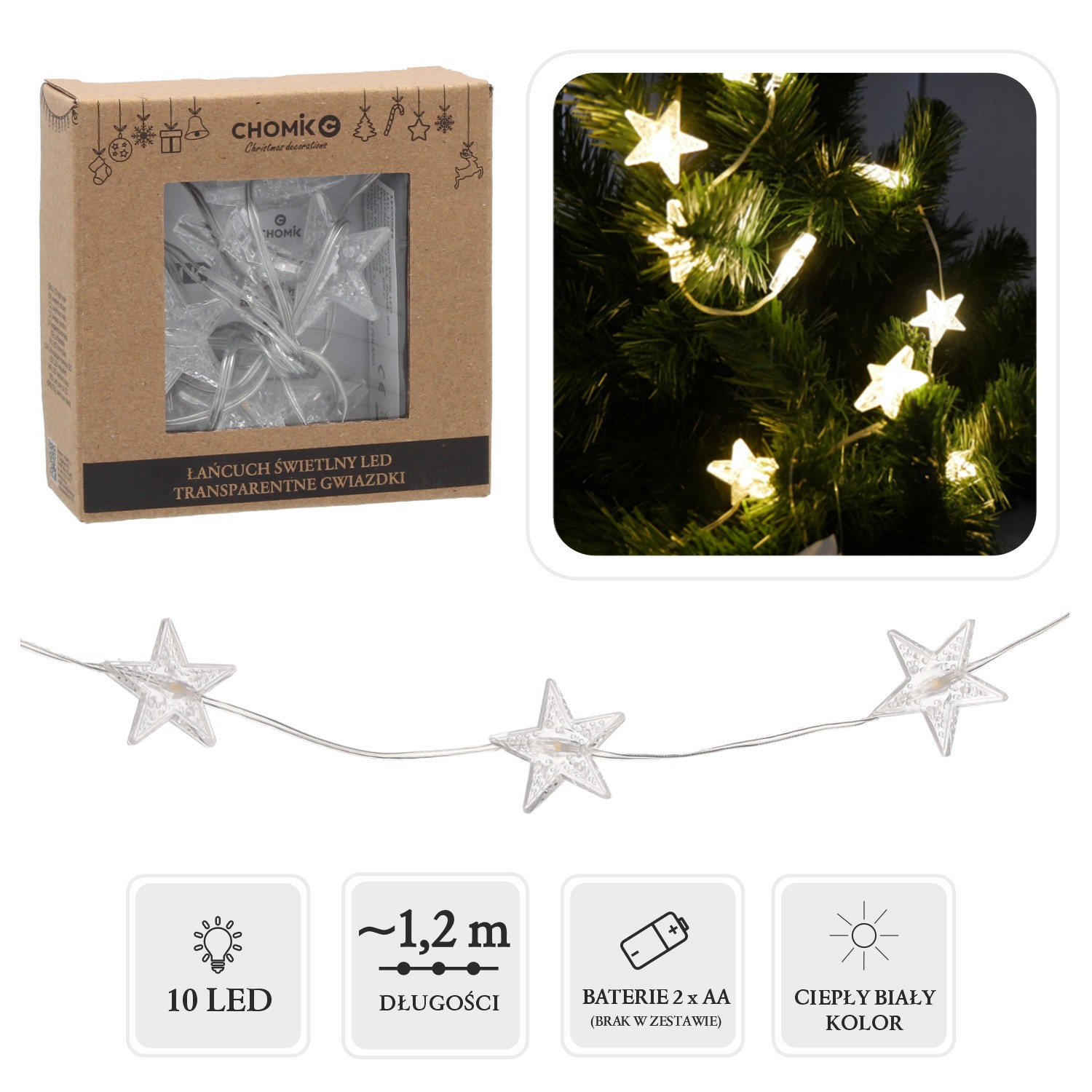 Додайте блиску своїм інтер'єрам за допомогою витонченого світлодіодного ланцюга у формі прозорих зірочок. Елегантний дизайн і тепле біле світло роблять його ідеальним доповненням до святкових прикрас або атмосферного освітлення протягом усього року.