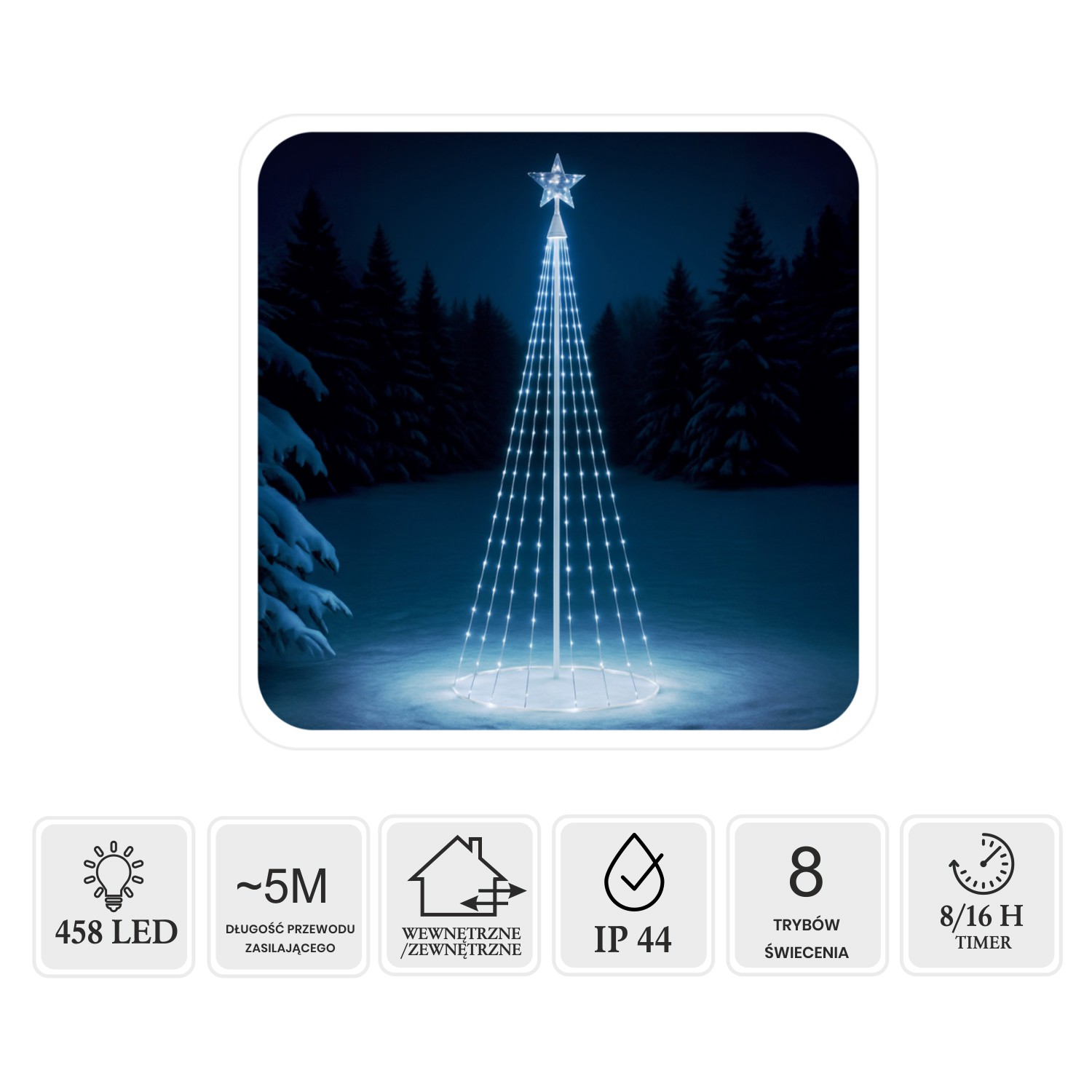 Сучасна конусна ялинка LED висотою 3 метри - це ефектна прикраса, яка вражає своїм крижаним блиском. Оснащена 458 світлодіодами LED холодного білого кольору, вона красиво освітлює сад, терасу або велике приміщення, створюючи елегантну і святкову атмосферу. Міцний металевий каркас забезпечує стабільність, а зірка на верхівці підкреслює винятковий характер прикраси. 8-функціональний програматор з пам'яттю та таймер 8/16 годин забезпечують зручне управління та налаштування світлових ефектів. Прозорий кабель та клас герметичності IP44 роблять ялинку придатною як для використання всередині, так і зовні.