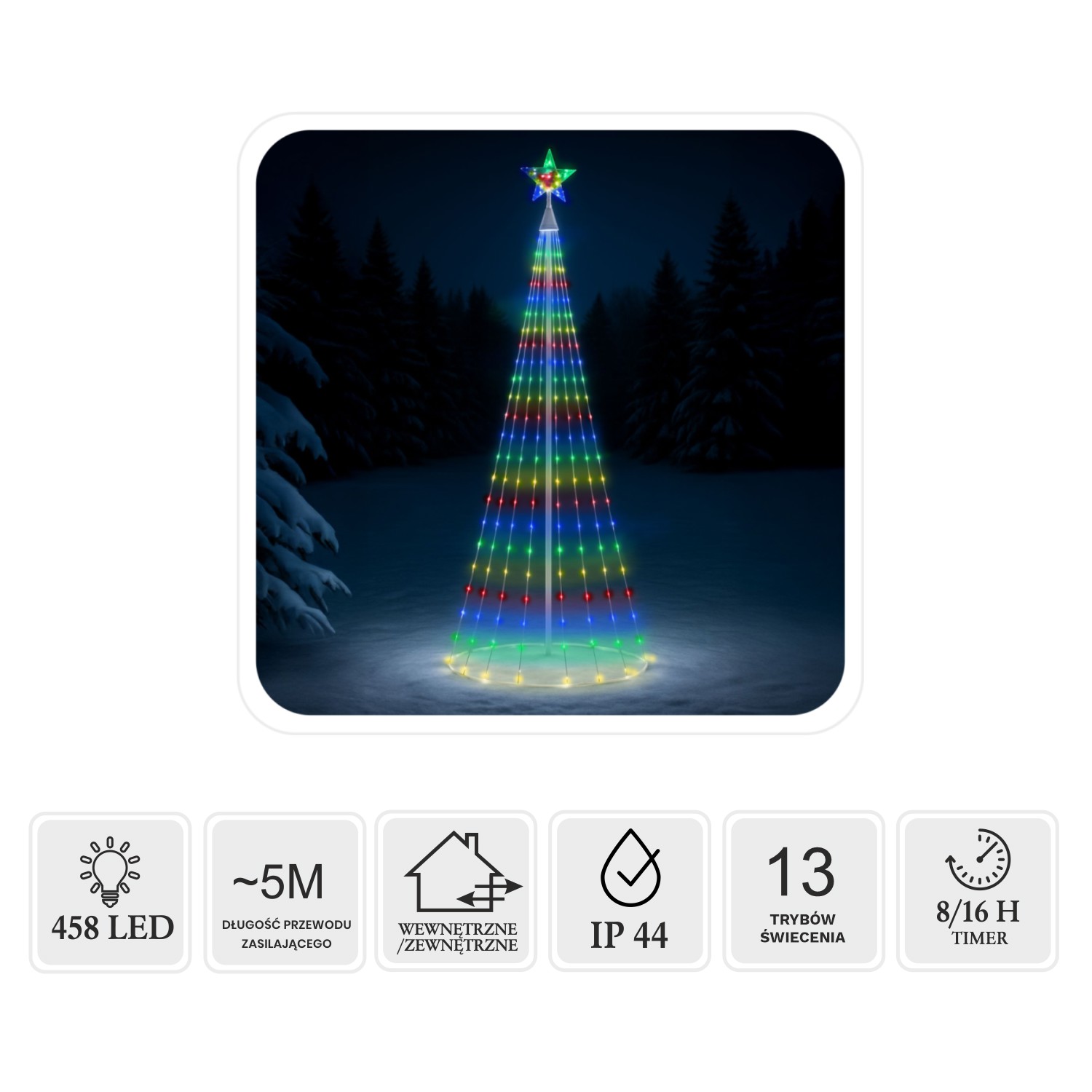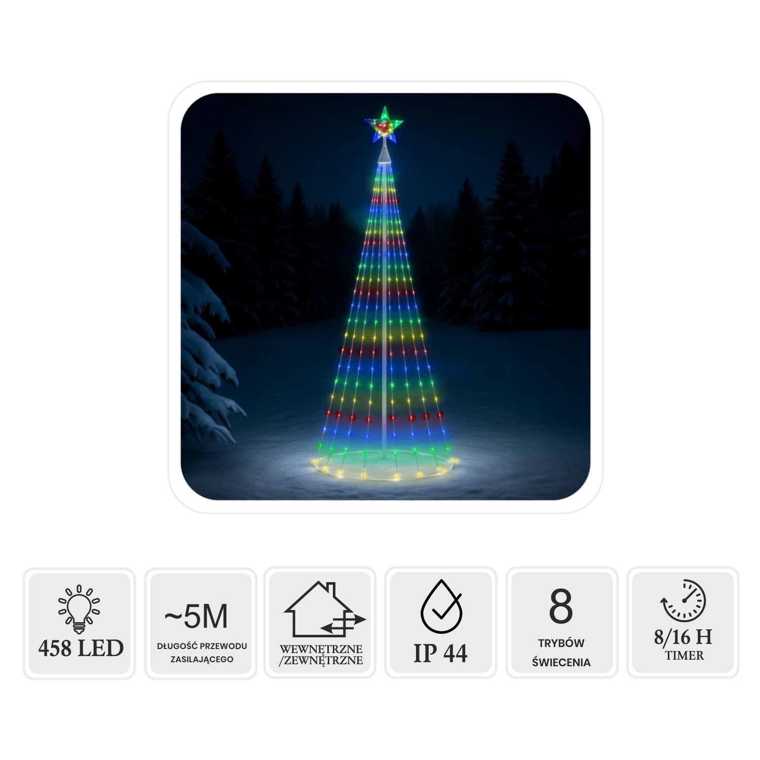 Ефектна конусна ялинка LED висотою 3 метри - це унікальна прикраса, яка освітлить будь-який сад, терасу або велике приміщення. Завдяки 458 різнокольоровим діодам прикраса створює надзвичайно радісну і святкову атмосферу. Конструкція на металевому каркасі є стабільною і міцною, а зірка на верхівці додає всій композиції чарівності. Комплект оснащений 8-функціональним програматором з пам'яттю і таймером 8/16 годин, що дозволяє налаштувати світлові ефекти і забезпечує зручність використання. Прозорий кабель і клас герметичності IP44 роблять ялинку ідеальною як для зовнішнього, так і для внутрішнього використання.