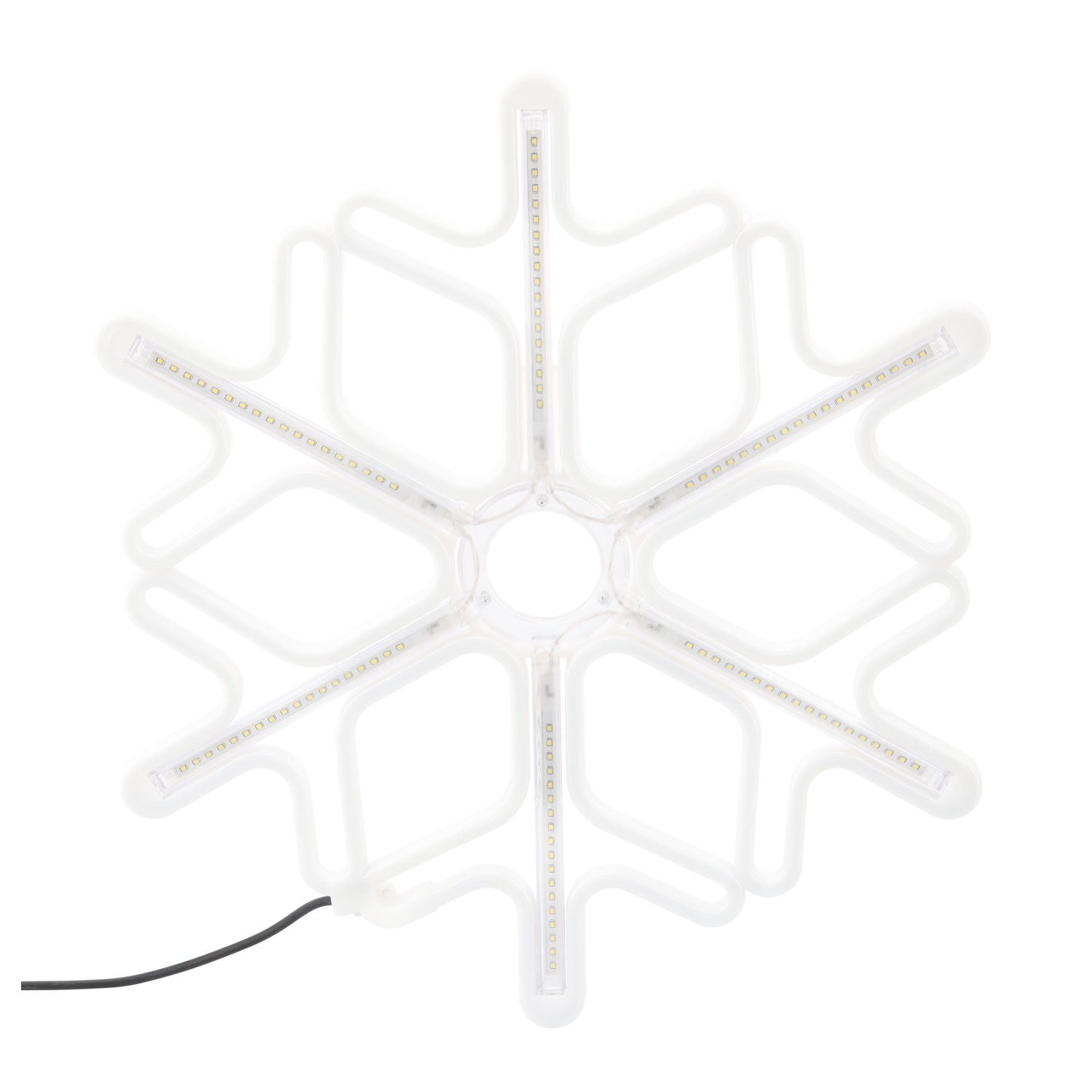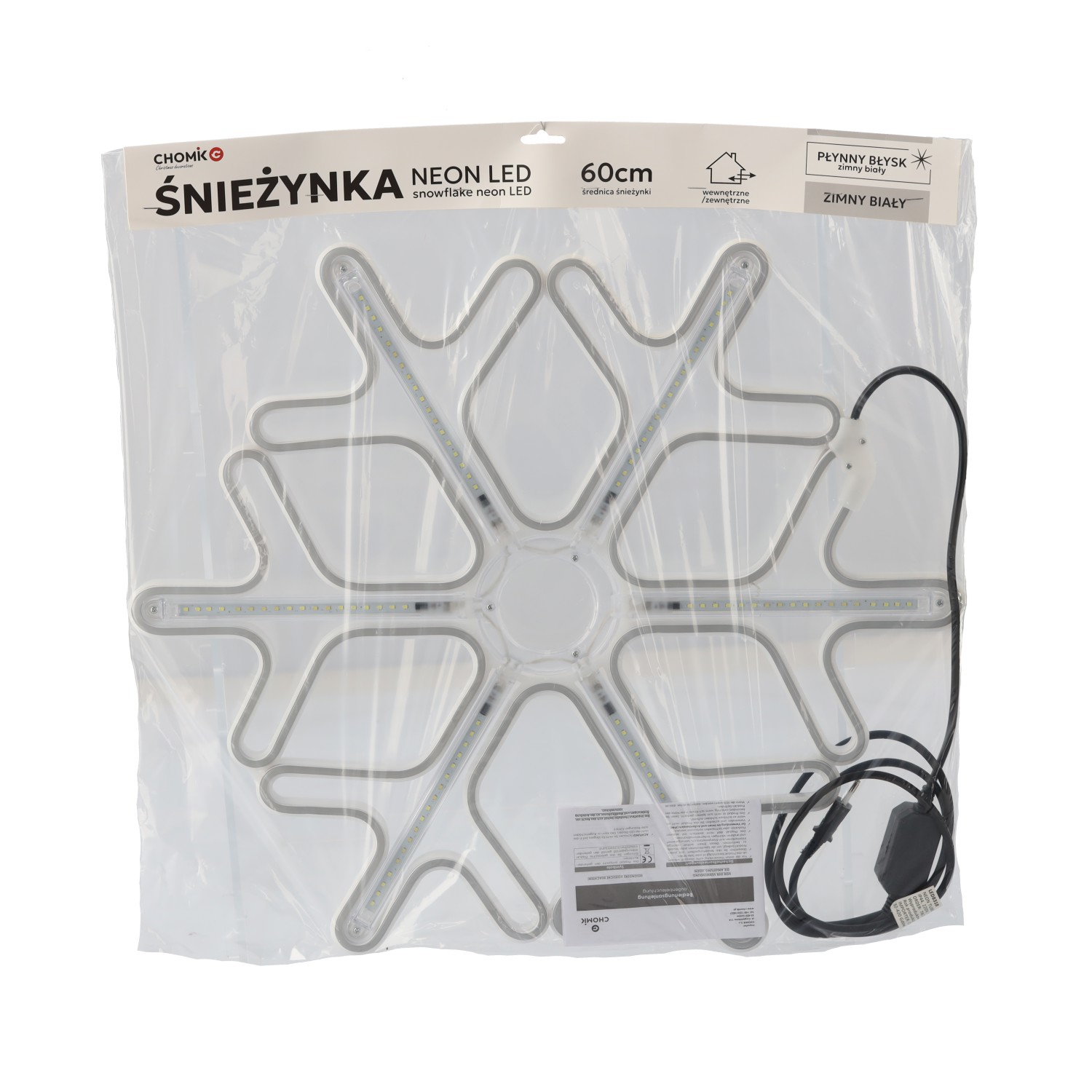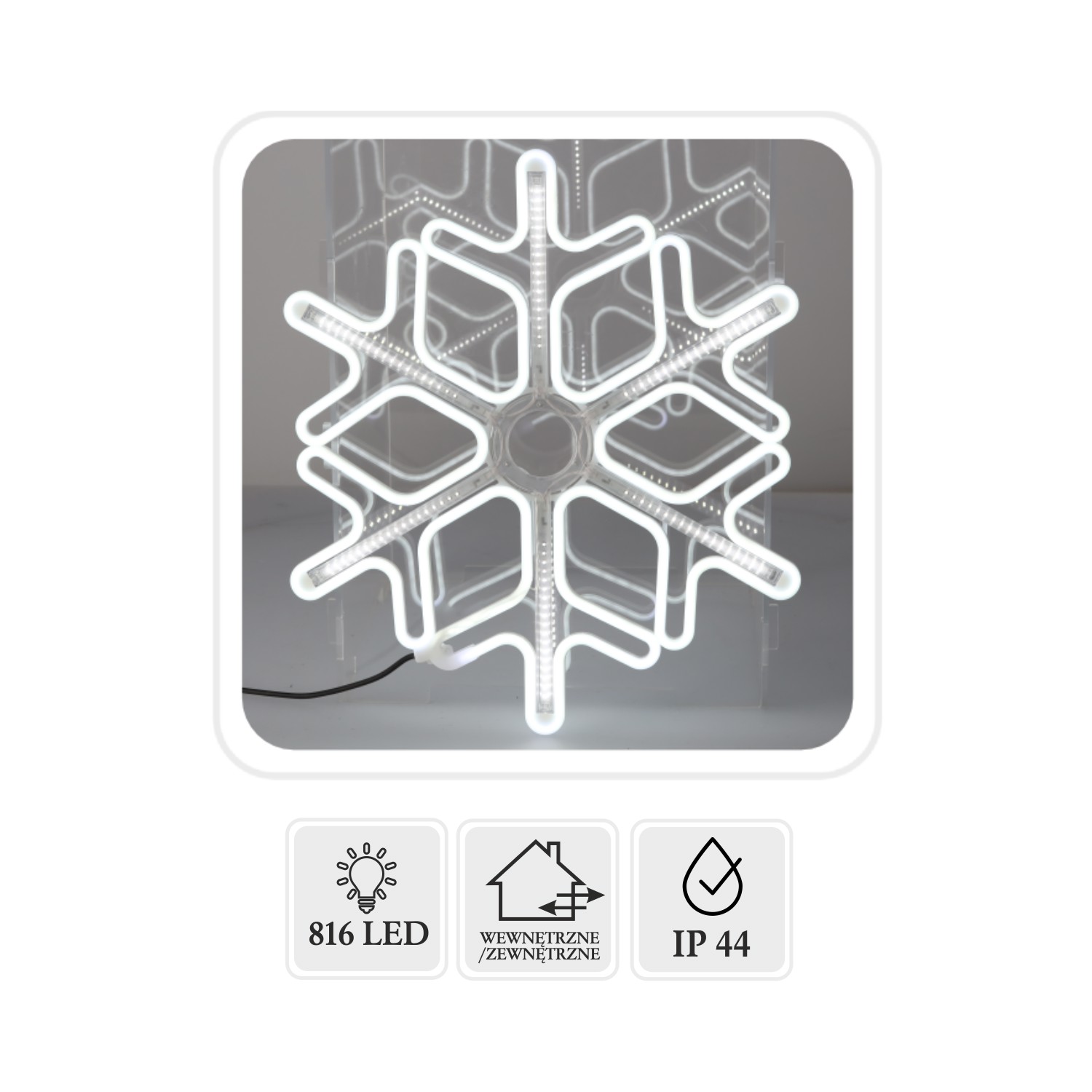 Ефектна різдвяна прикраса у вигляді неонової сніжинки діаметром 60 см. Виготовлена з двосторонньої LED-трубки, оснащена 816 діодами холодного білого кольору з додаванням холодного флешу, створює інтенсивне зимове сяйво. Ідеально підходить для прикраси фасадів, балконів, вітрин магазинів або інтер'єрів, створюючи особливу атмосферу свята. Завдяки класу герметичності IP44 її можна безпечно використовувати як у приміщеннях, так і на вулиці.