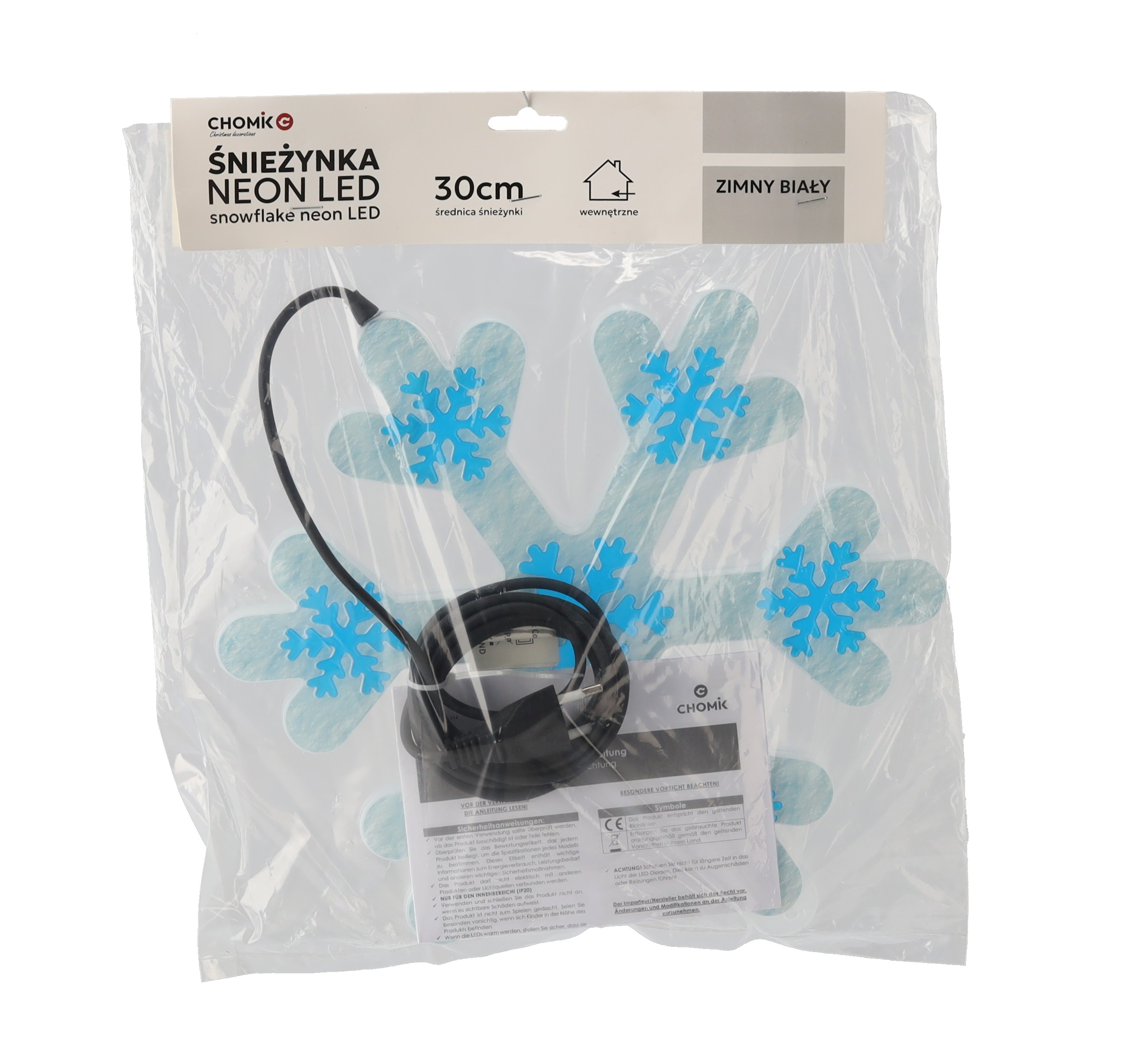 > Кількість діодів: 240L> Спосіб світіння: неонова трубка LED - двостороння> Колір діодів: холодний білий> Діаметр сніжинки: 30 см> Довжина шнура живлення: 2 м> Відстань між діодами: 8,3 см> Колір ізоляції: чорний> Клас герметичності: IP20> Тільки для внутрішнього використання!> Режим освітлення: постійний> Номінальна напруга: 220 В> Перетин шнура живлення: 4,2 мм> Сертифікат CE